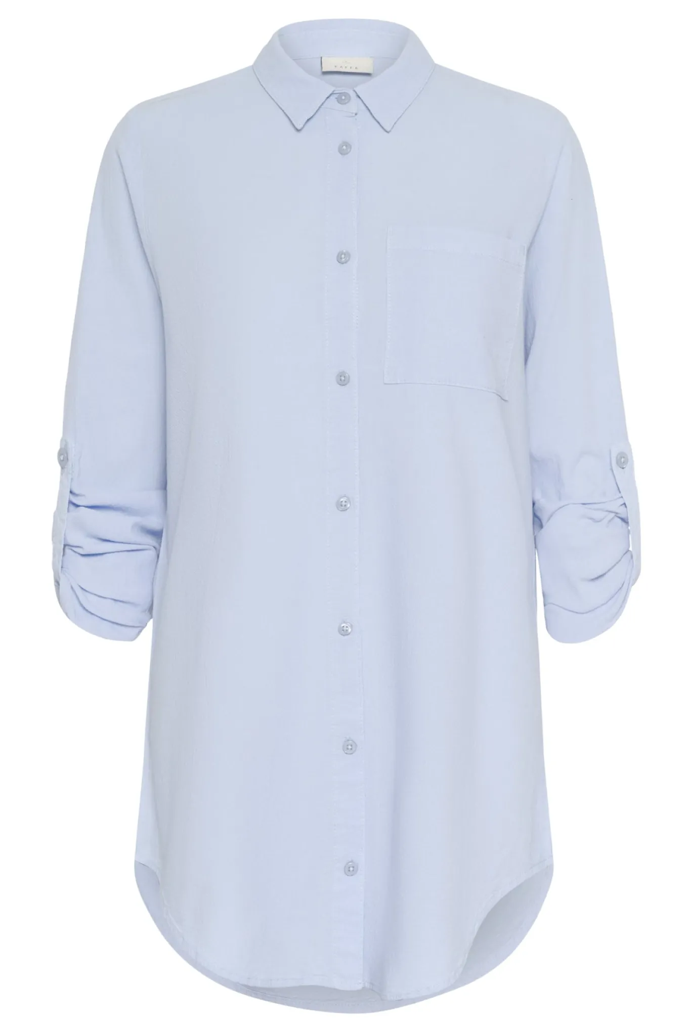 OBS! Fjernlager. Levering kan blive forlænget med 2-3 dage, hvis varen ikke findes i vores butik lige nu.Smart tunika fra Kaffe med lange ærmer, en lille krave i halsen og en fin lomme på brystet.Tunikaen har også afrundede kanter, en afslappet pasform og knaplukning langs fronten.