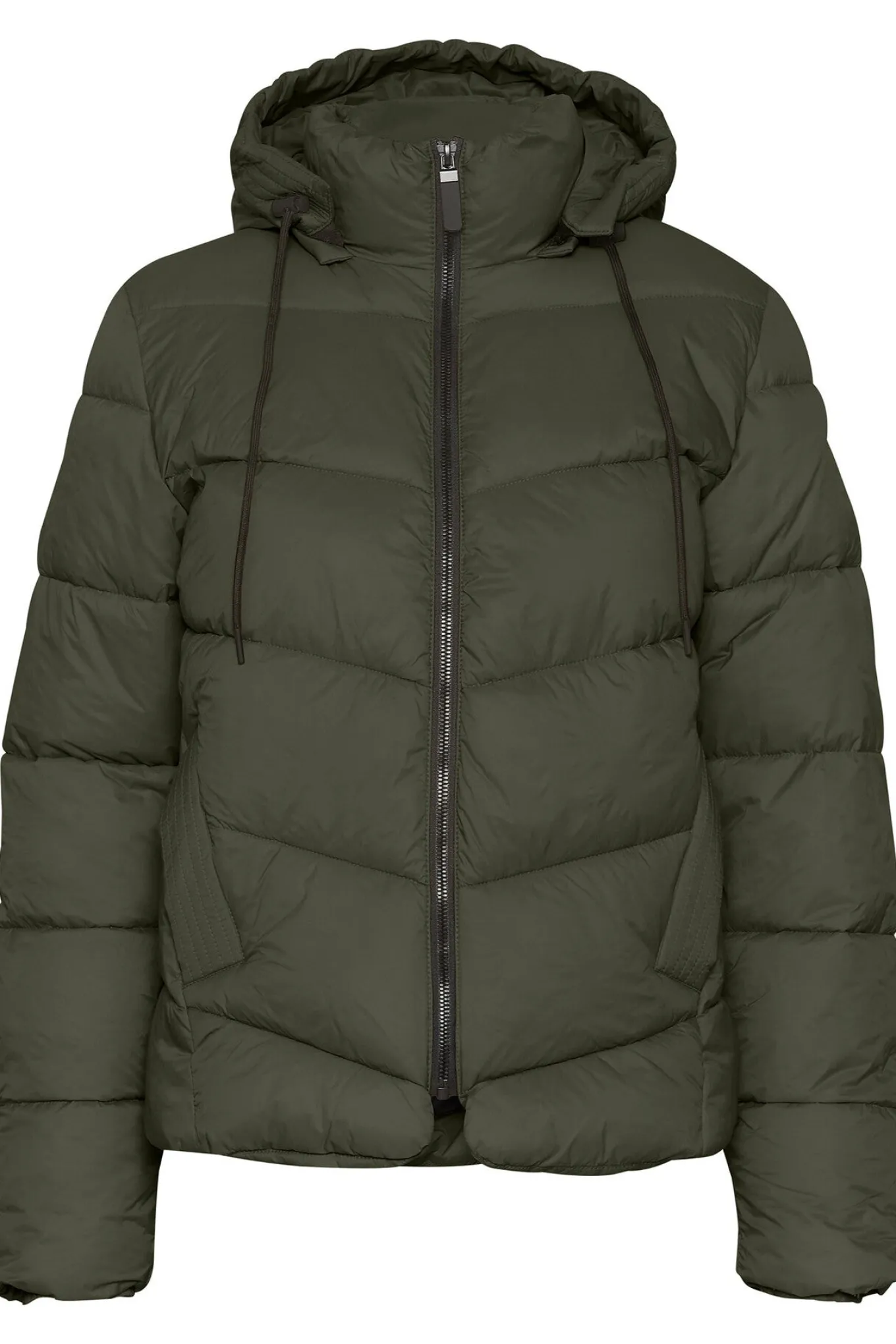OBS! Fjernlager. Levering kan blive forlænget med 2-3 dage, hvis varen ikke findes i vores butik lige nu.Cool quiltet jakke fra Kaffe med lange ærmer, høj hals og justerbar hætte, lommer i siderne og lynlåslukning langs fronten.