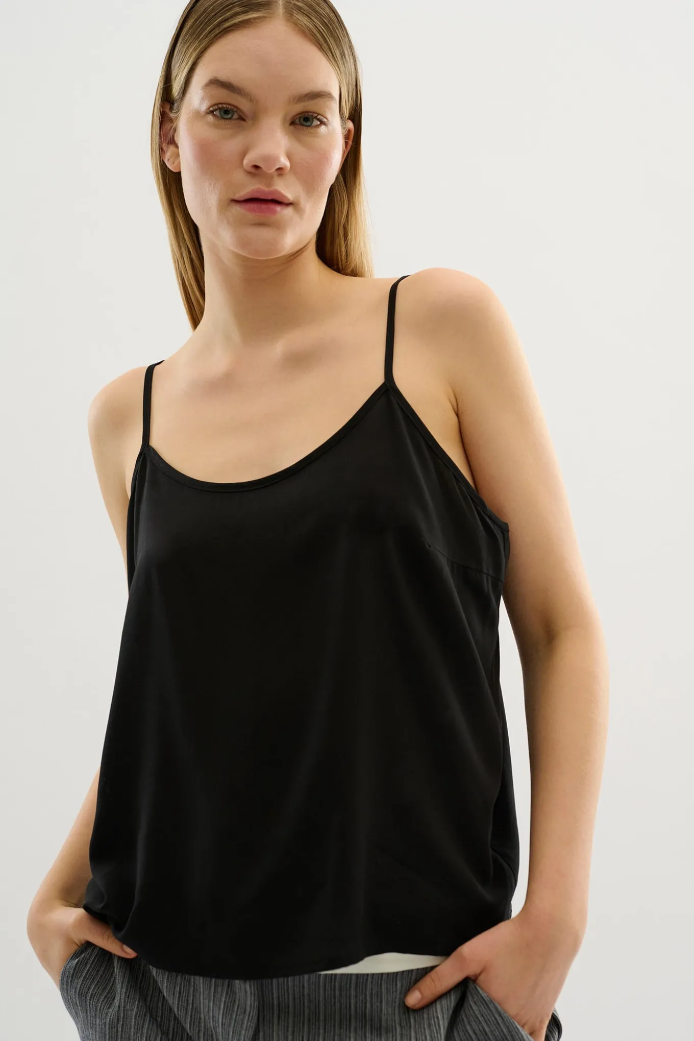 - OBS! Fjernlager. Levering kan blive forlænget med 2-3 dage, hvis varen ikke findes i vores butik lige nu.Flot top fra Karen By Simonsen med smalle justerbare skulderstropper.