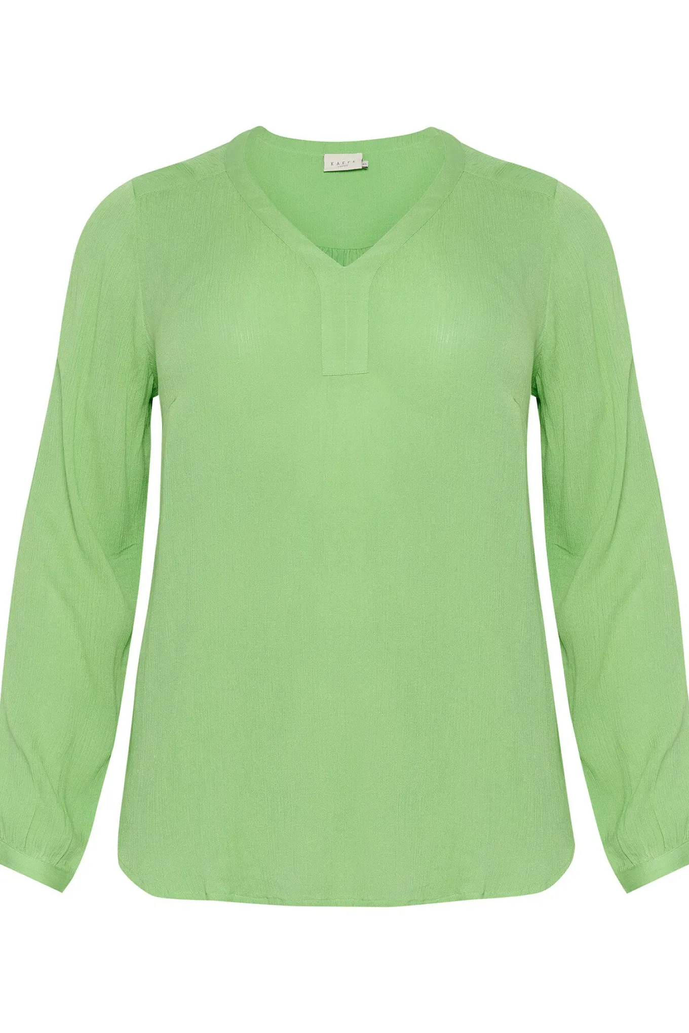 OBS! Fjernlager. Levering kan blive forlænget med 2-3 dage, hvis varen ikke findes i vores butik lige nu.Smart basis bluse fra Kaffe Curve med lange ærmer, v-udskæring i halsen og en dejlig let kvalitet.
