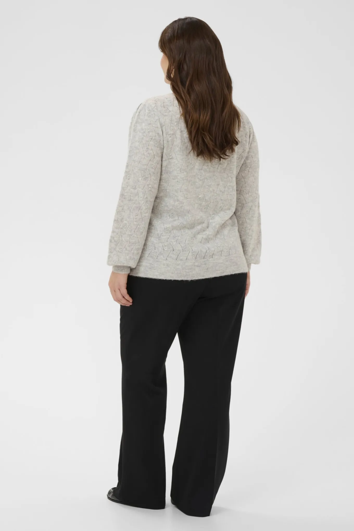 Skab en klassisk og tidløs stil med denne striktrøje fra Kaffe Curve. I en lys gråmeleret farve og lavet af blød akryl, polyester og elastan for optimal komfort.
