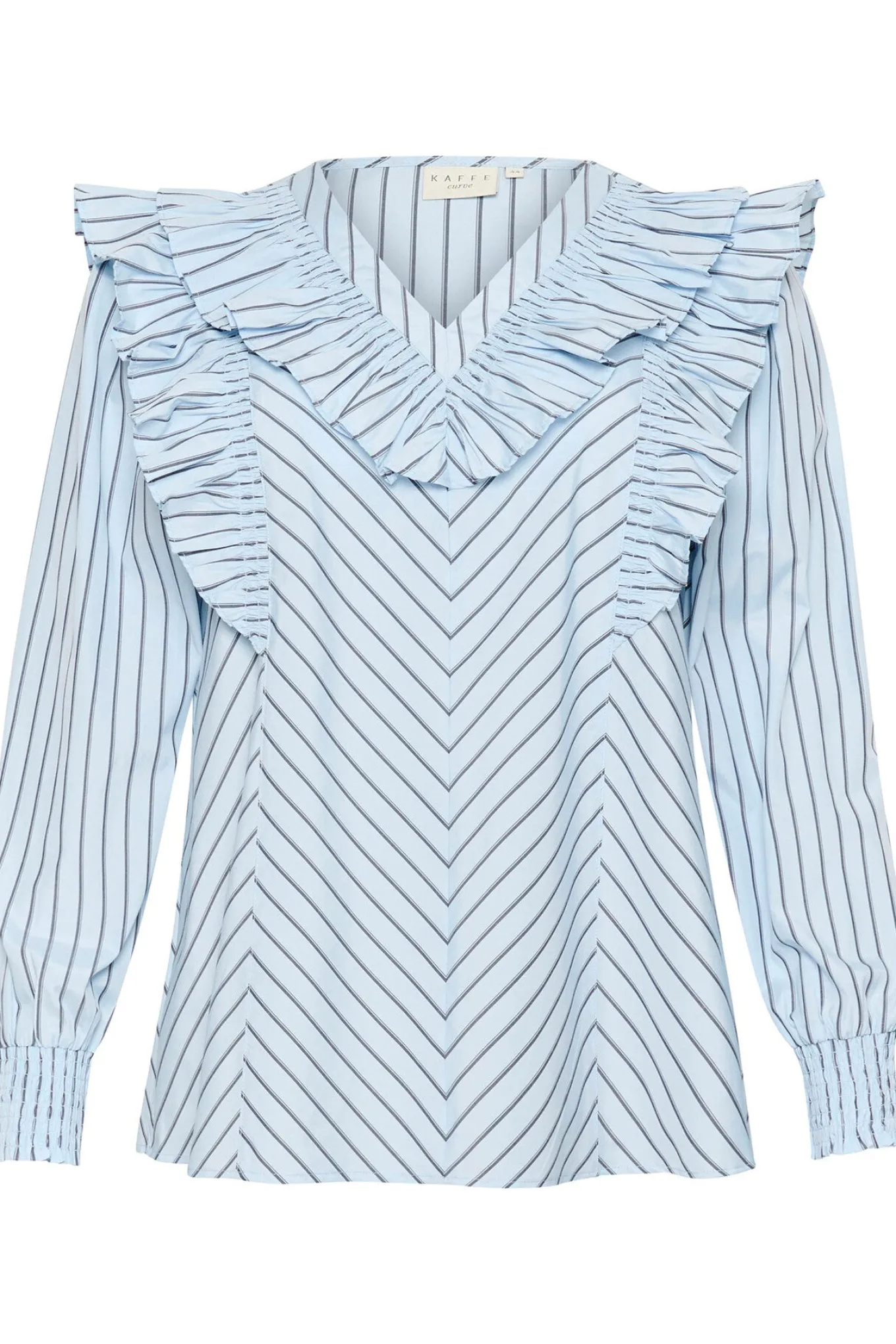 OBS! Fjernlager. Levering kan blive forlænget med 2-3 dage, hvis varen ikke findes i vores butik lige nu.Feminin bluse fra Kaffe Curve med lange pufærmer, tætsiddende smock manchetter og skønne flæser omkring skulderne og brystet.