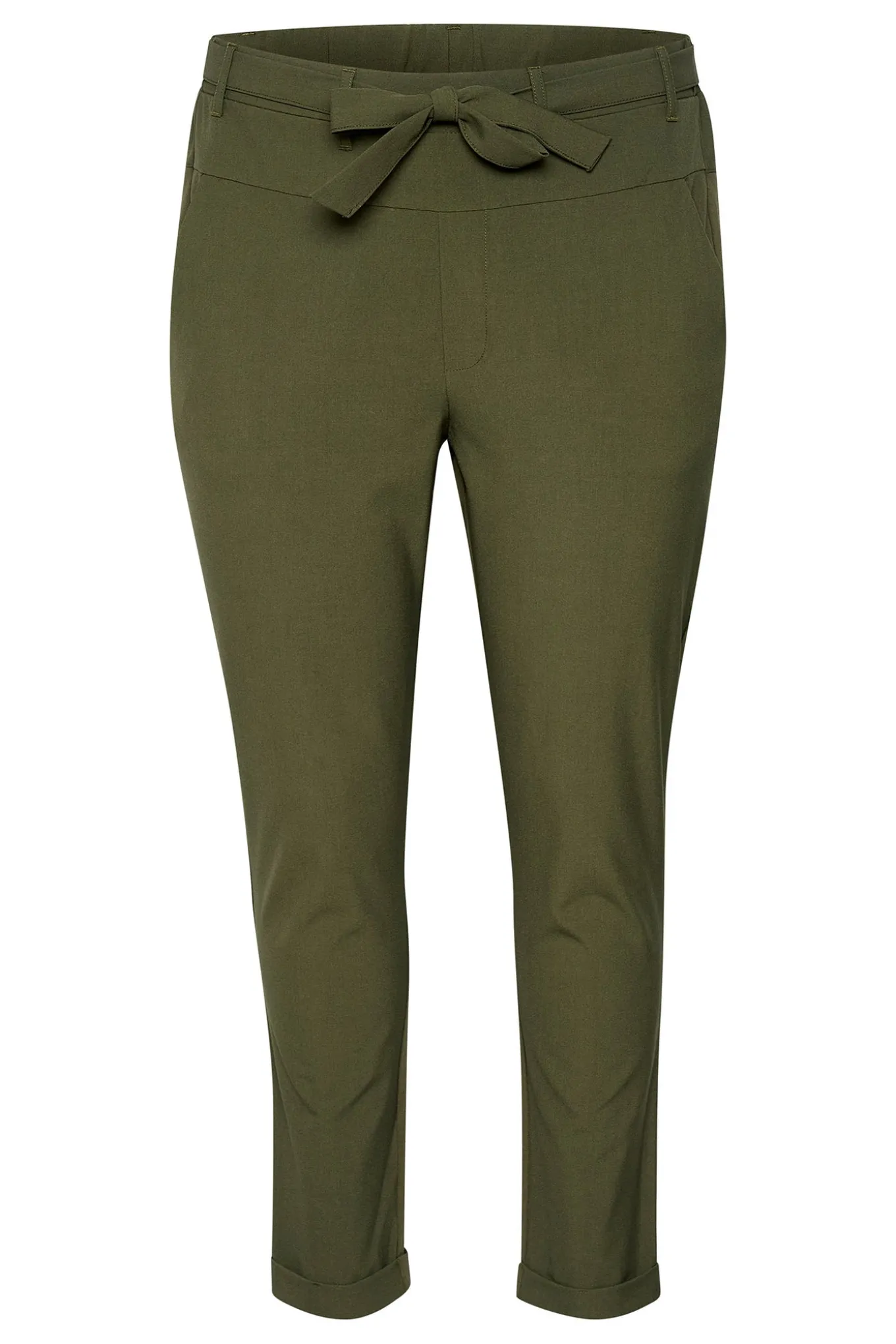 OBS! Fjernlager. Levering kan blive forlænget med 2-3 dage, hvis varen ikke findes i vores butik lige nu.Smarte bukser fra Kaffe Curve med elastikkant og bindebælte i taljen, en slim-leg silhuet og en lækker kvalitet.
