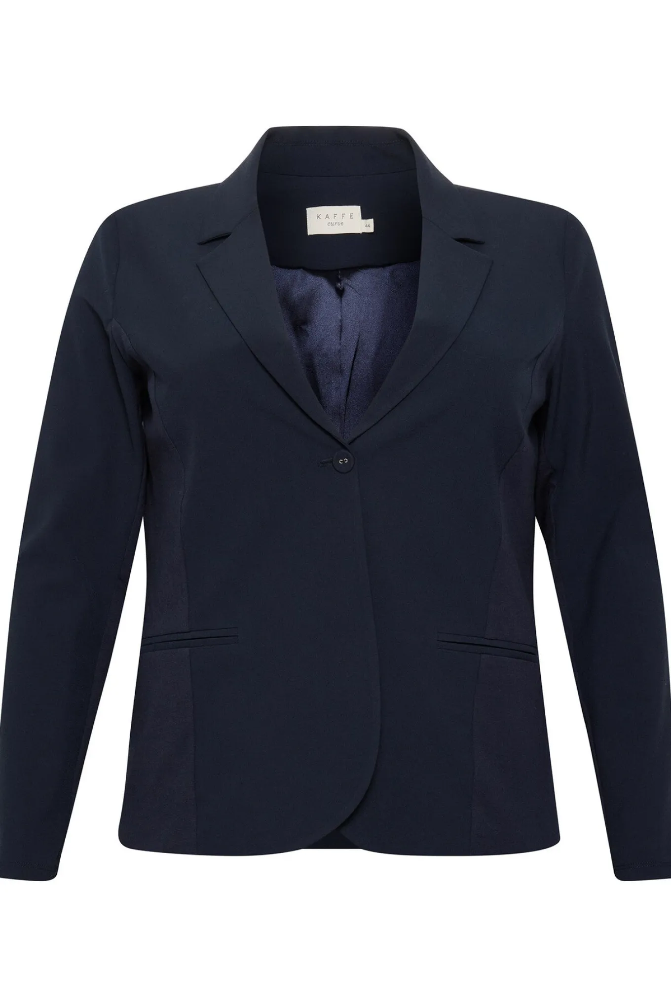 OBS! Fjernlager. Levering kan blive forlænget med 2-3 dage, hvis varen ikke findes i vores butik lige nu.Klassisk blazer fra Kaffe Curve med lange ærmer, v-udskæring i halsen og knaplukning foran.