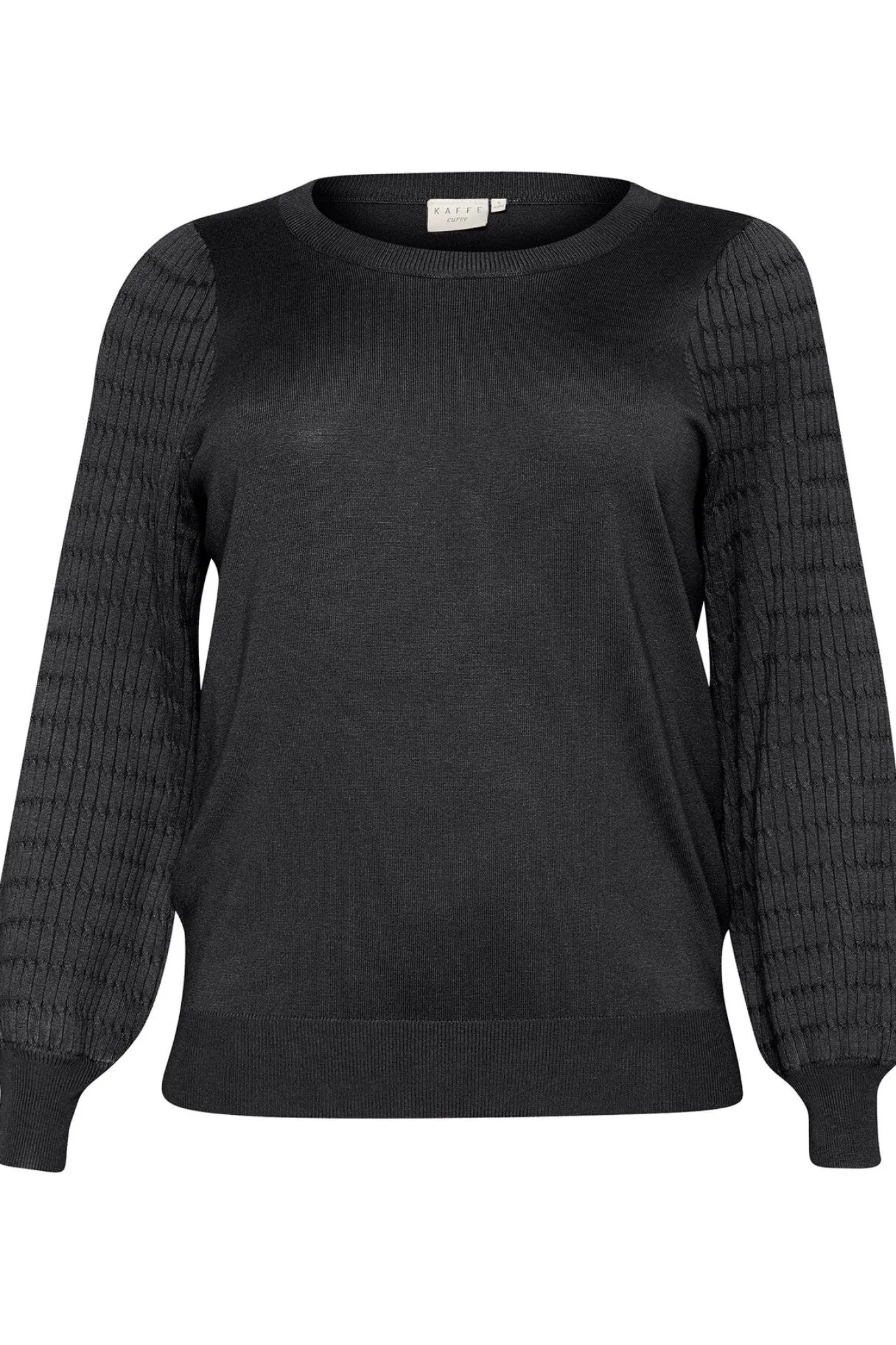 OBS! Fjernlager. Levering kan blive forlænget med 2-3 dage, hvis varen ikke findes i vores butik lige nu.Fin enkel strik fra Kaffe Curve med lange pufærmer, rund halsudskæring og fine detaljer i ærmerne.