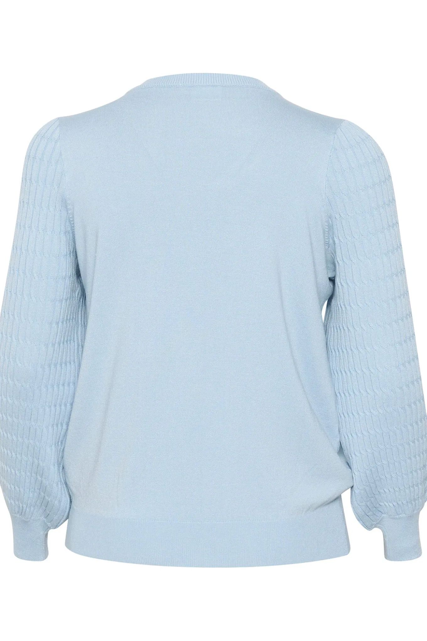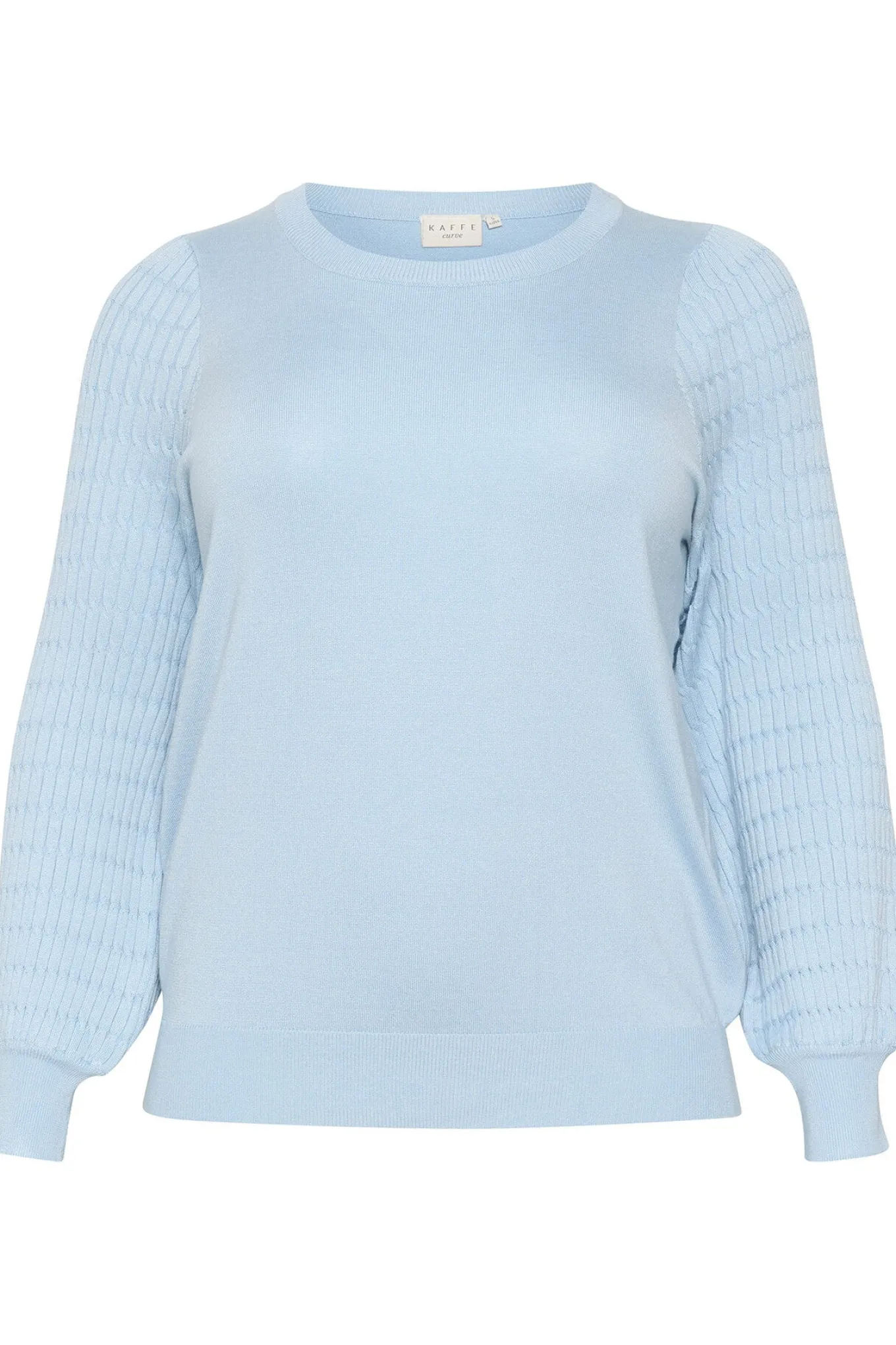 OBS! Fjernlager. Levering kan blive forlænget med 2-3 dage, hvis varen ikke findes i vores butik lige nu.Fin enkel strik fra Kaffe Curve med lange pufærmer, rund halsudskæring og fine detaljer i ærmerne.