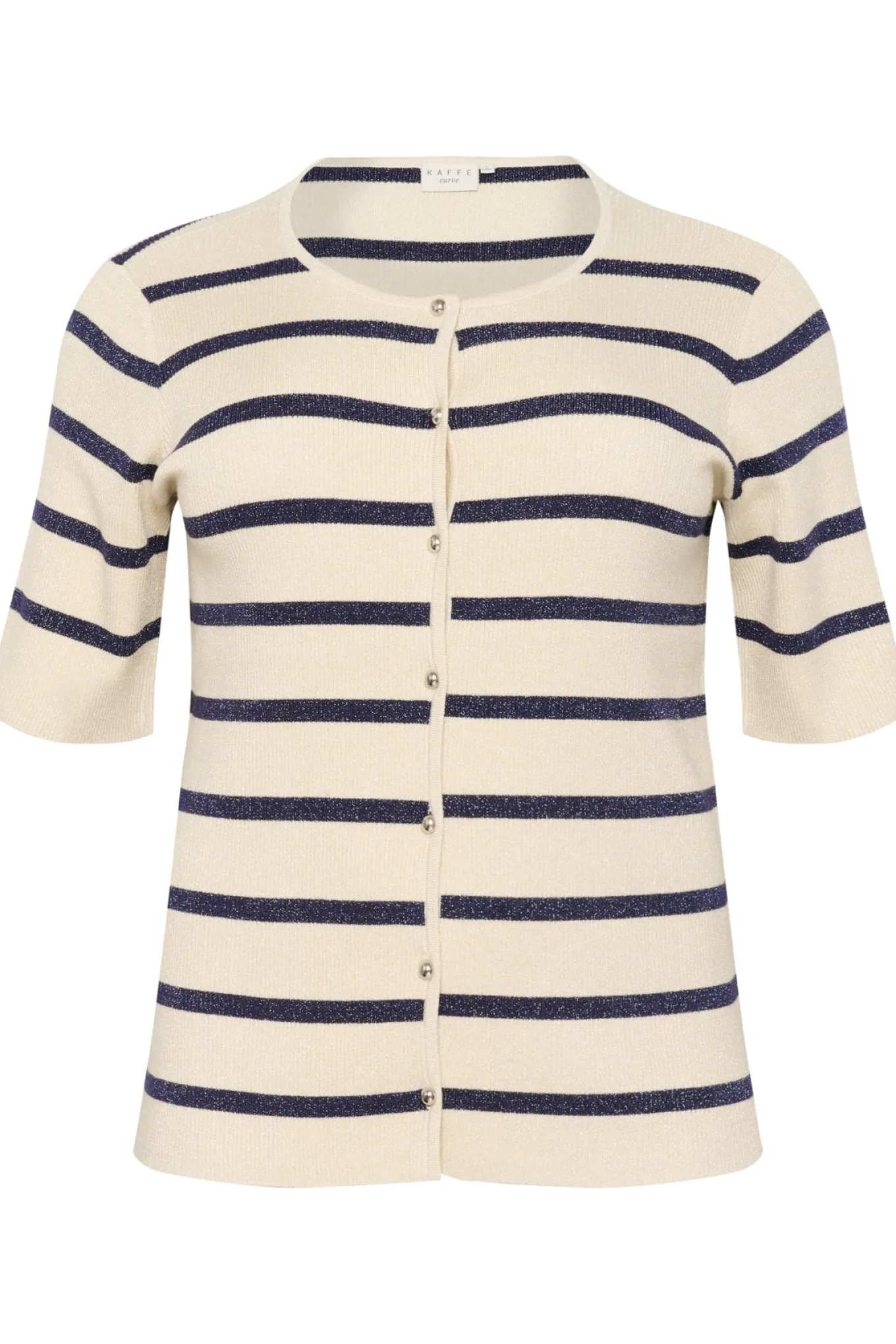 OBS! Fjernlager. Levering kan blive forlænget med 1-2 dage, hvis varen ikke findes i vores butik lige nu.Klassisk cardigan fra Kaffe Curve med ½ lange ærmer, rund hals og knaplukning langs fronten.