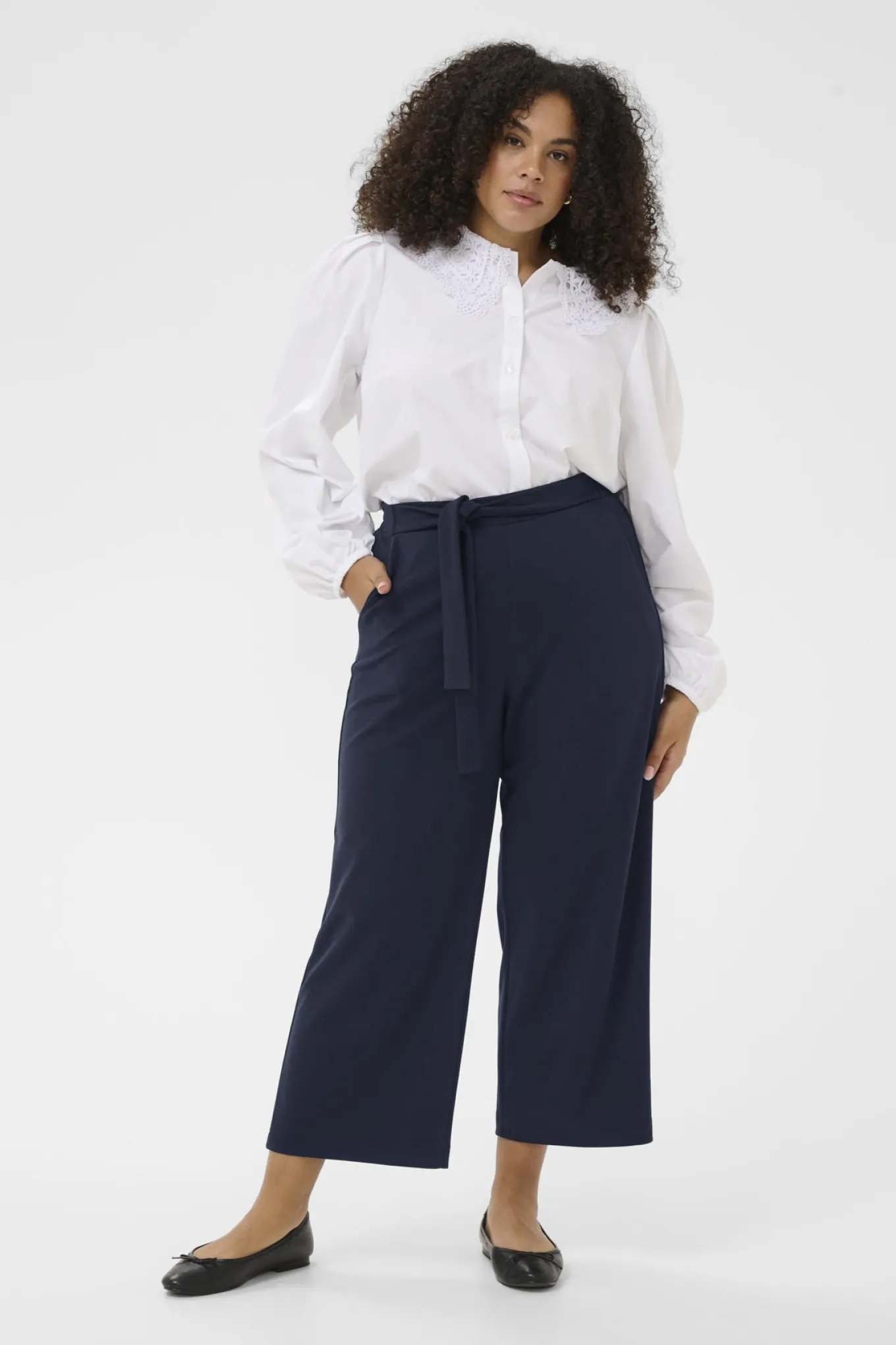 Få et tidløst og stilfuldt look med disse bukser fra Kaffe Curve. Den mørkeblå farve, lavet af 50% genbrugspolyester, giver et elegant touch til dit outfit. Perfekt til enhver anledning.