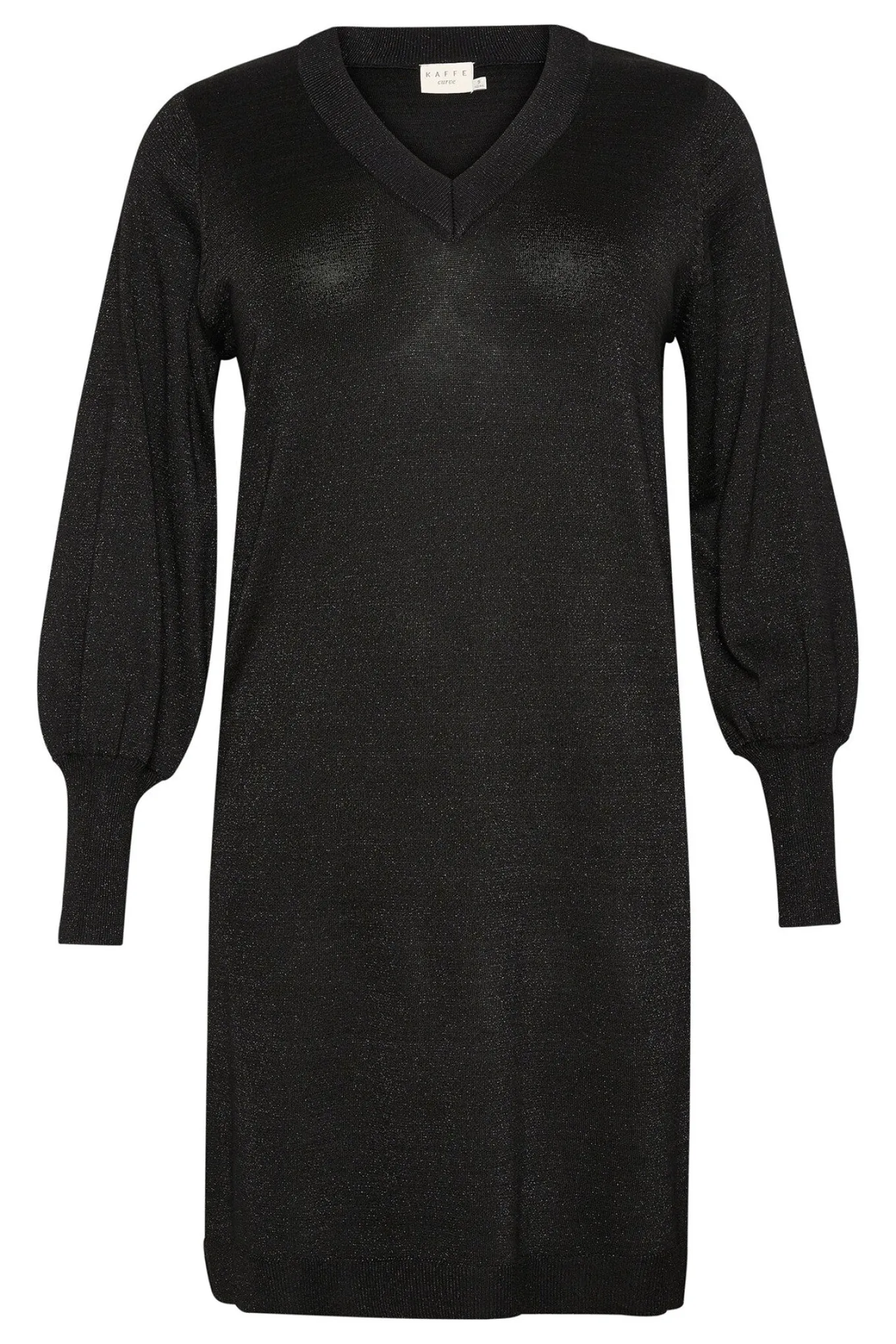- OBS! Fjernlager. Levering kan blive forlænget med 2-3 dage, hvis varen ikke findes i vores butik lige nu.Flot strikkjole fra Kaffe Curve med lange pufærmer, brede tætsiddende manchetter og v-udskæring i halsen.Kjolen har også en løs silhuet og en fin glimmerkvalitet.