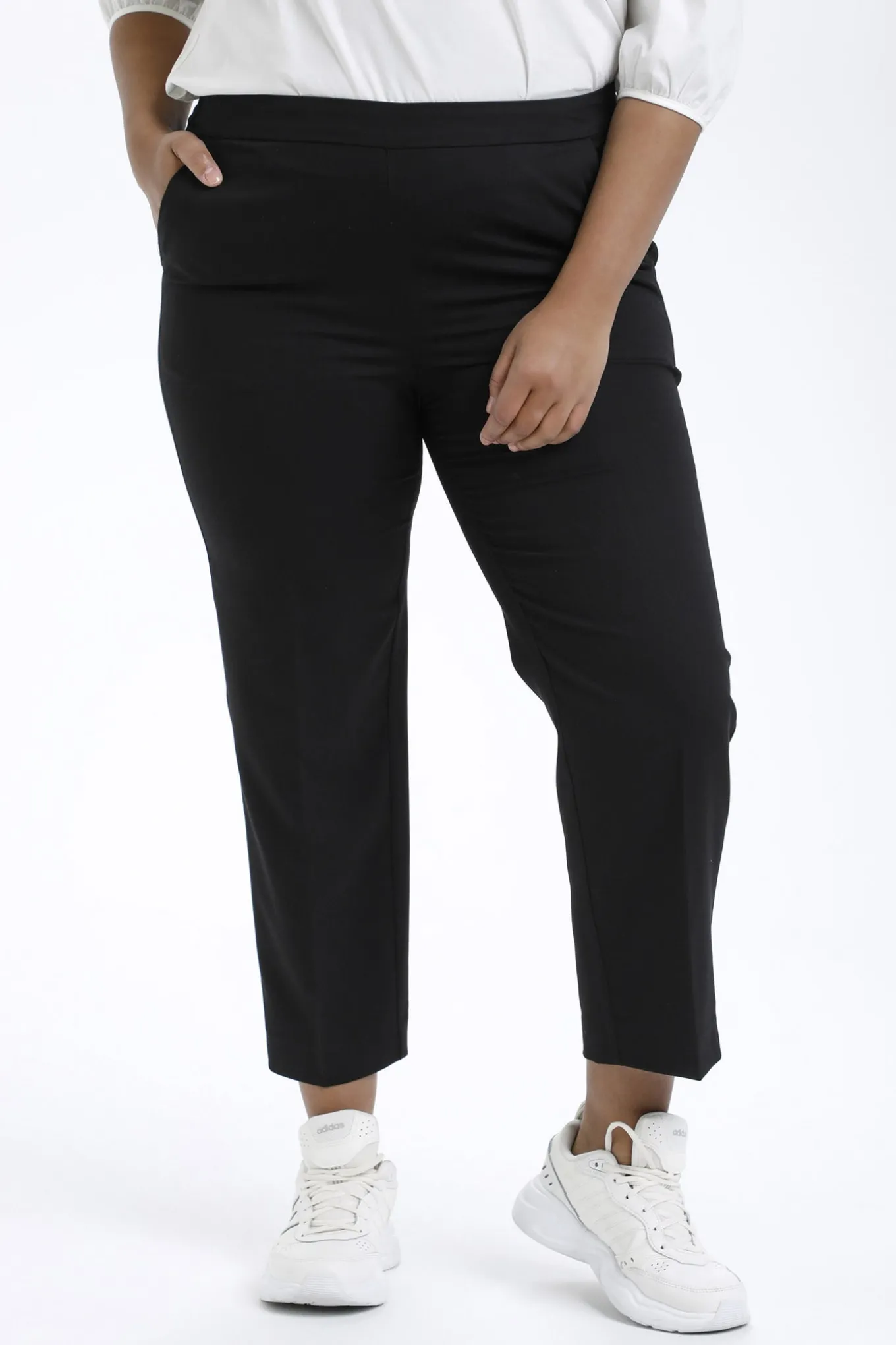 OBS! Fjernlager. Levering kan blive forlænget med 2-3 dage, hvis varen ikke findes i vores butik lige nu.Fine bukser fra Kaffe Curve med elastikkant i taljen, et straight-leg snit og en cropped længde.