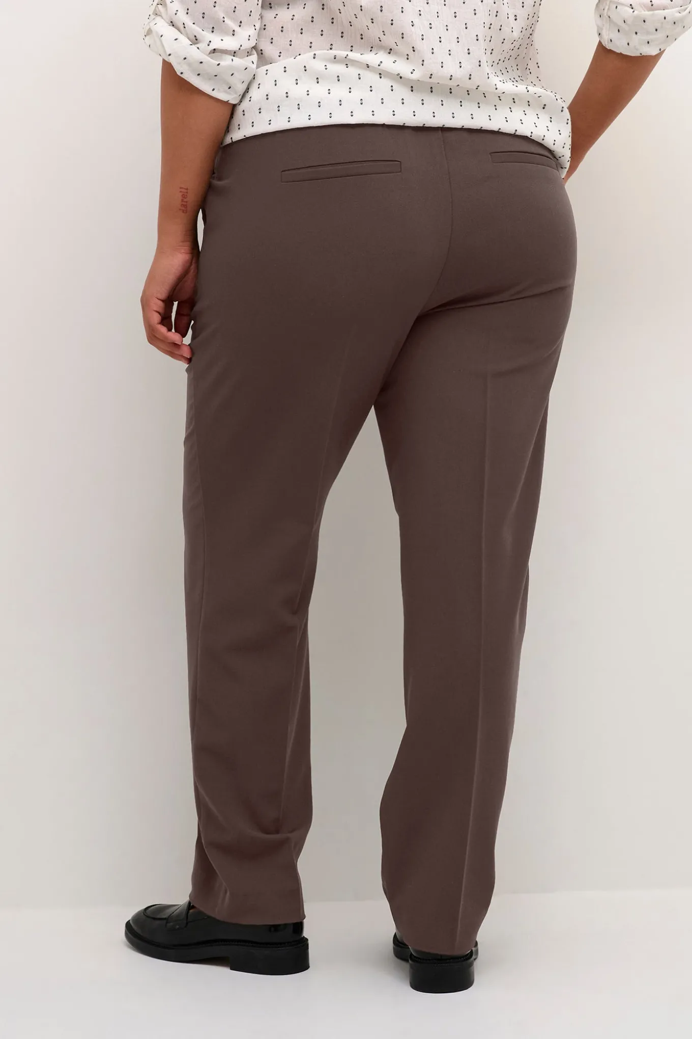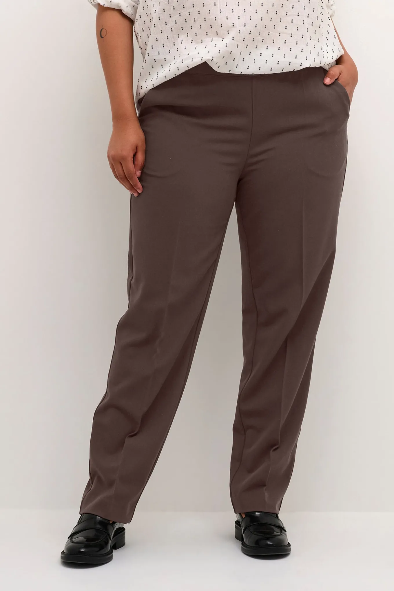 OBS! Fjernlager. Levering kan blive forlænget med 2-3 dage, hvis varen ikke findes i vores butik lige nu.Flotte bukser fra Kaffe Curve med et straight-leg snit, elastikkant i taljen og lommer i siderne. Bukserne har også en lækker kvalitet og fine pressefolder langs fronten.