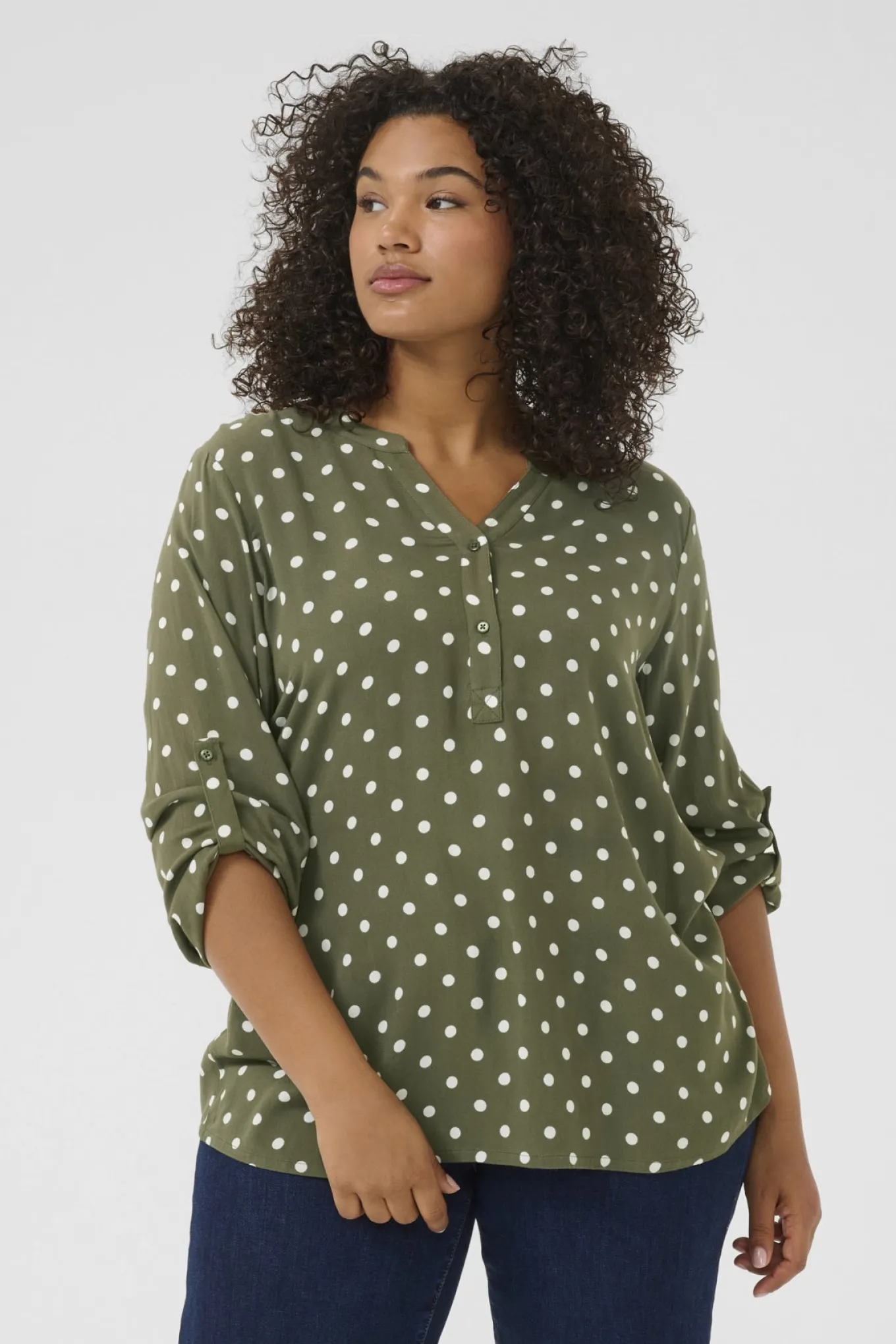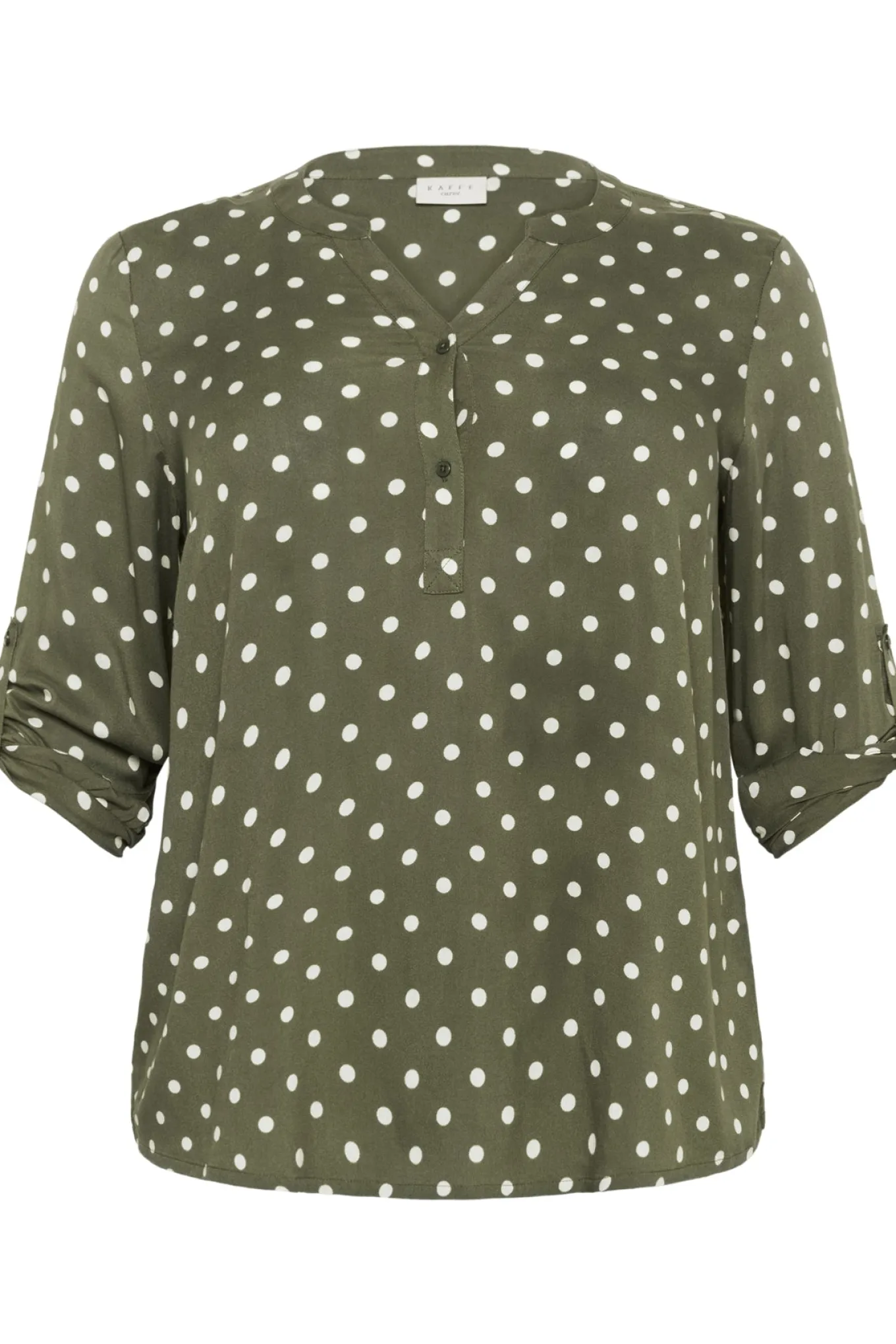 Skab et stilfuldt og tidløst look med denne bluse i Grape Leaf fra Kaffe Curve. Den er lavet af 100% LENZING™ ECOVERO™ viskose og har et elegant Chalk Dot mønster. Perfekt til enhver lejlighed.
