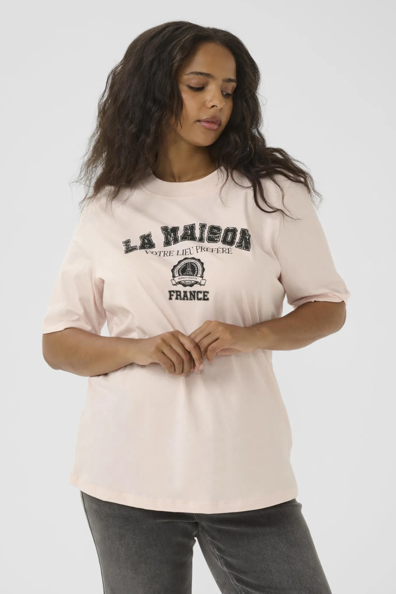OBS! Fjernlager. Levering kan blive forlænget med 2-3 dage, hvis varen ikke findes i vores butik lige nu.Smart tee fra Kaffe Curve med ½ lange ærmer, rund hals og et fint print på brystet.
