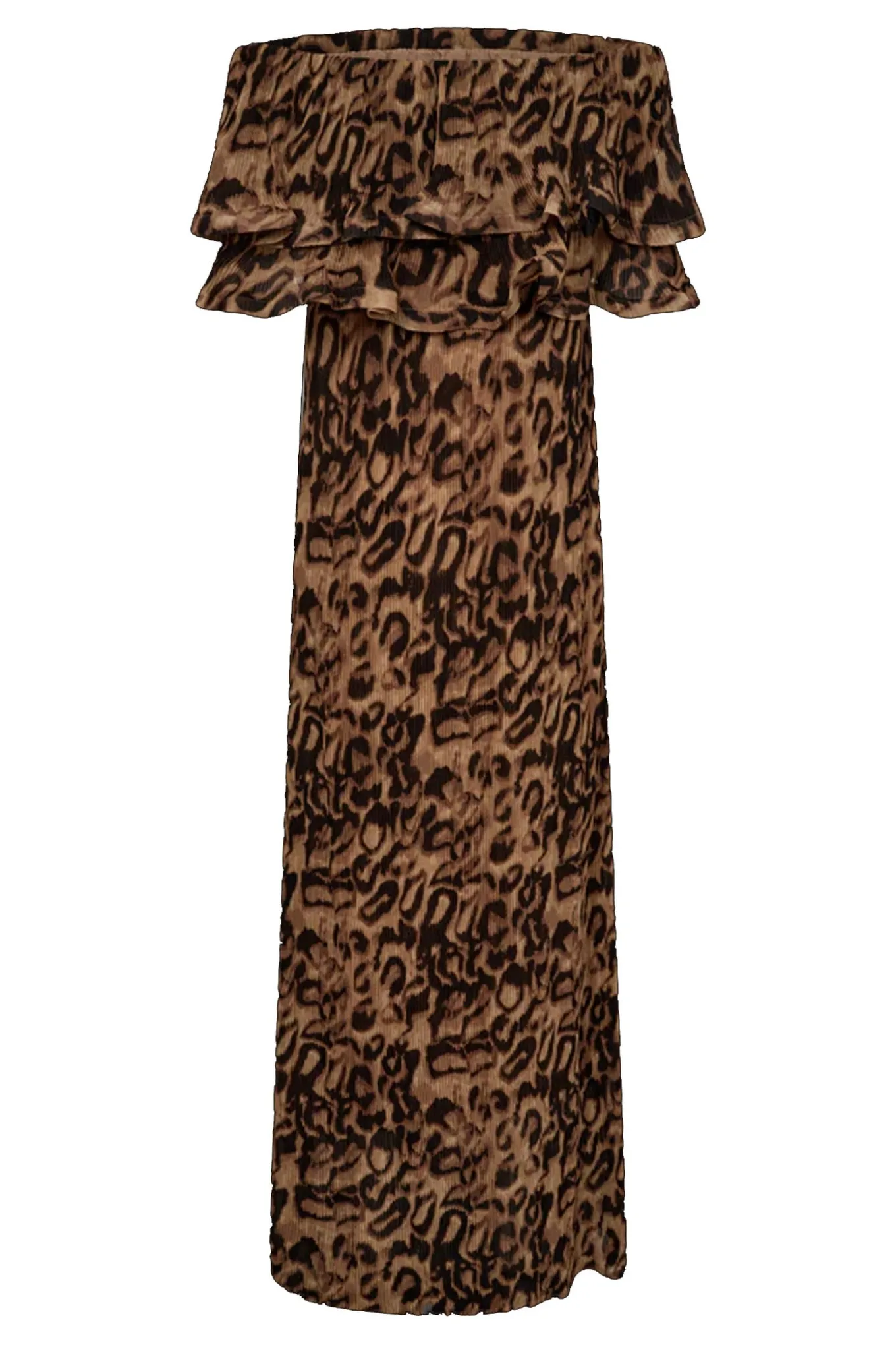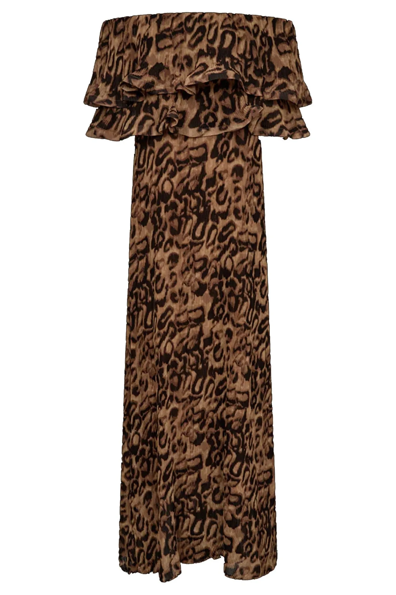 - OBS! Fjernlager. Levering kan blive forlænget med 2-3 dage, hvis varen ikke findes i vores butik lige nu.Off-shoulder kjole fra Copenhagen Muse i en smuk, plisseret kvalitet med leopardprint, flæser i overdelen samt en lige pasform, der giver en flatterende effekt og passer til alle kropstyper.