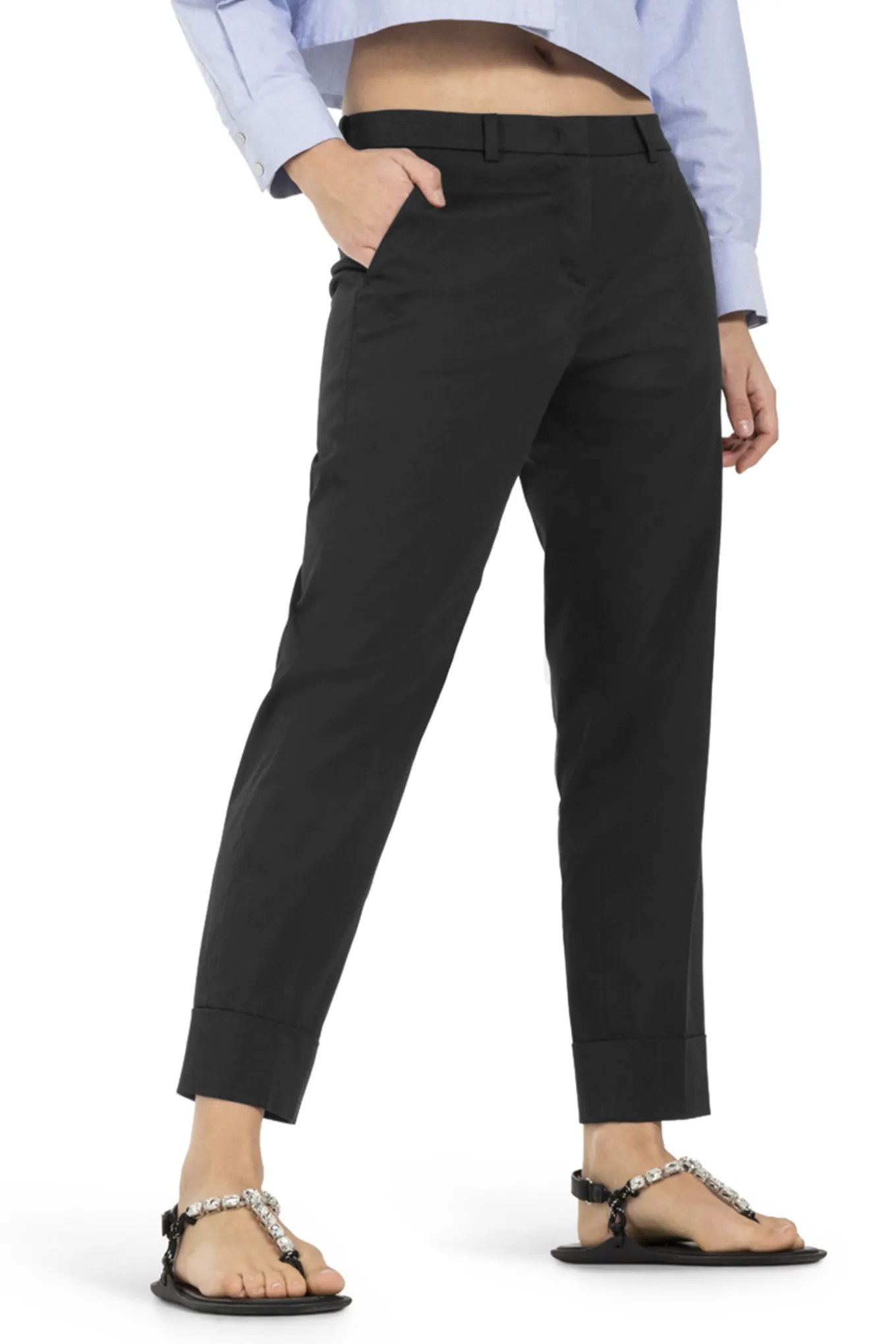 OBS! Fjernlager. Levering kan blive forlænget med 2-3 dage, hvis varen ikke findes i vores butik lige nu.Flotte bukser fra Cambio med en cropped længde, klassisk lommer og fine pressefolder langs fronten.