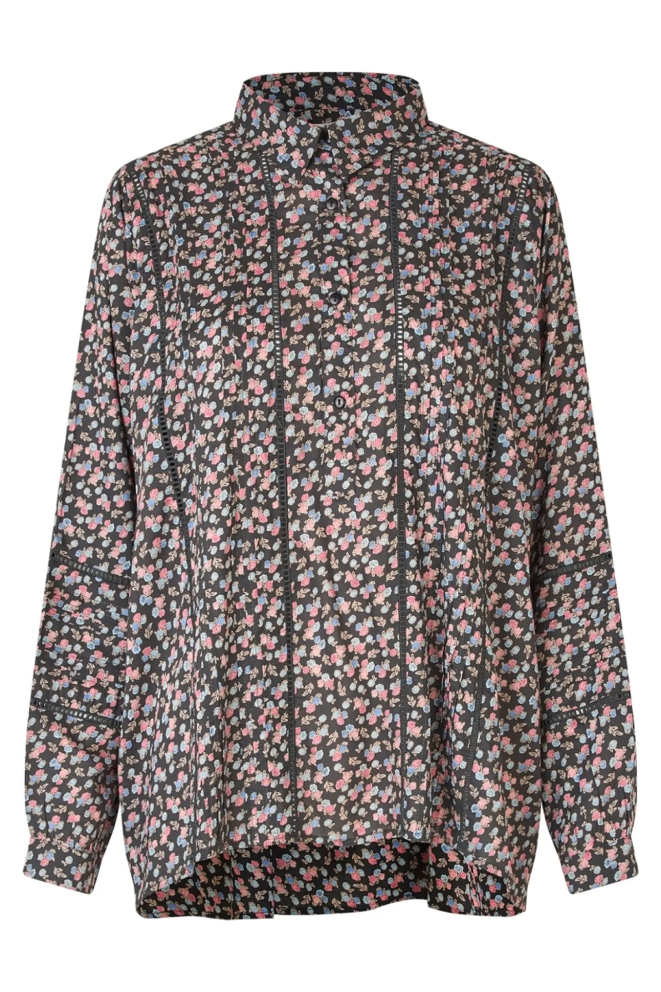 Feminin og ubesværet elegant stil med et vintage-inspireret blomsterprint i bløde toner af pink, blå og beige på en mørk base. Skjorten her fra Lollys Laundry er lavet af 100% blød viskose og har en løs pasform med delikate rynker, der giver den et smukt fald.
