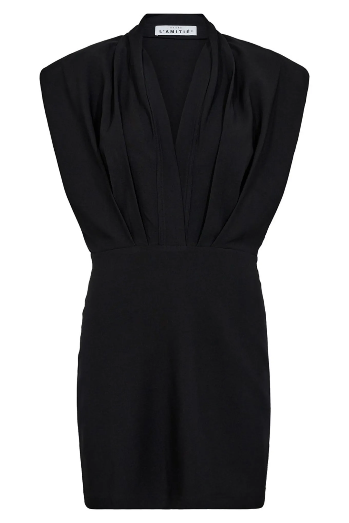 Få et elegant og stilfuldt look med denne sorte kjole fra Haute L’Amitie. Kjolen har et feminint snit, v-udskæring i halsen og smukke draperet effekter.