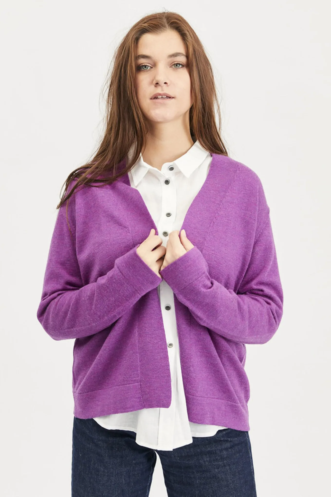 Omfavn efteråret med stil med denne varme og bløde cardigan fra LIND. Den lilla nuance og det 100% merinouldsmateriale giver et elegant touch til din garderobe.