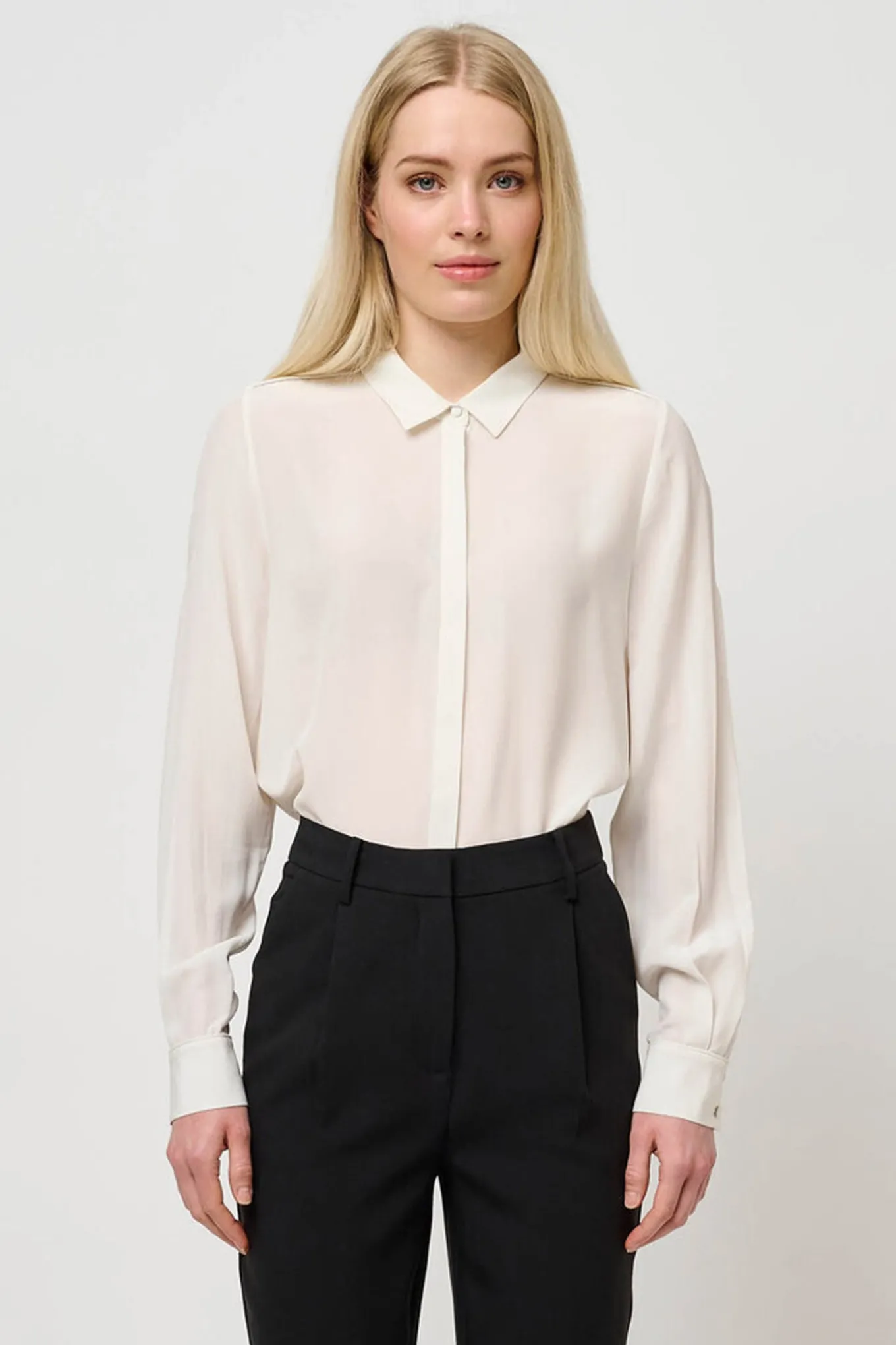 - OBS! Fjernlager. Levering kan blive forlænget med 2-3 dage, hvis varen ikke findes i vores butik lige nu.Elegant silke skjorte fra Bruuns Bazaar med lange ærmer, en lille krave i halsen og skjult knaplukning langs fronten.