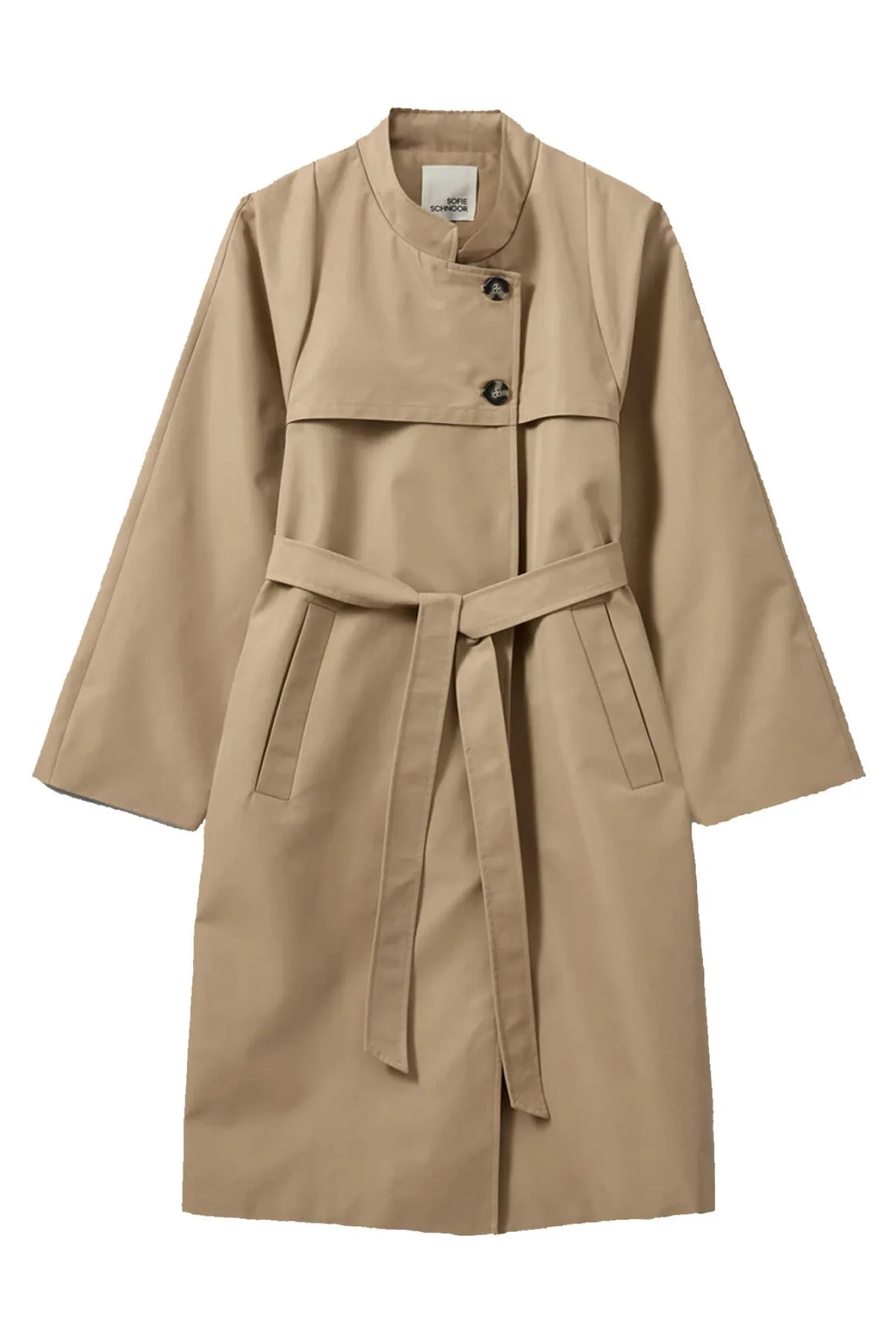 - OBS! Fjernlager. Levering kan blive forlænget med 2-3 dage, hvis varen ikke findes i vores butik lige nu.Helt klassisk trenchcoat fra Sofie Schnoor med lange ærmer, store lommer i siderne og et bredt bindebælte i taljen.