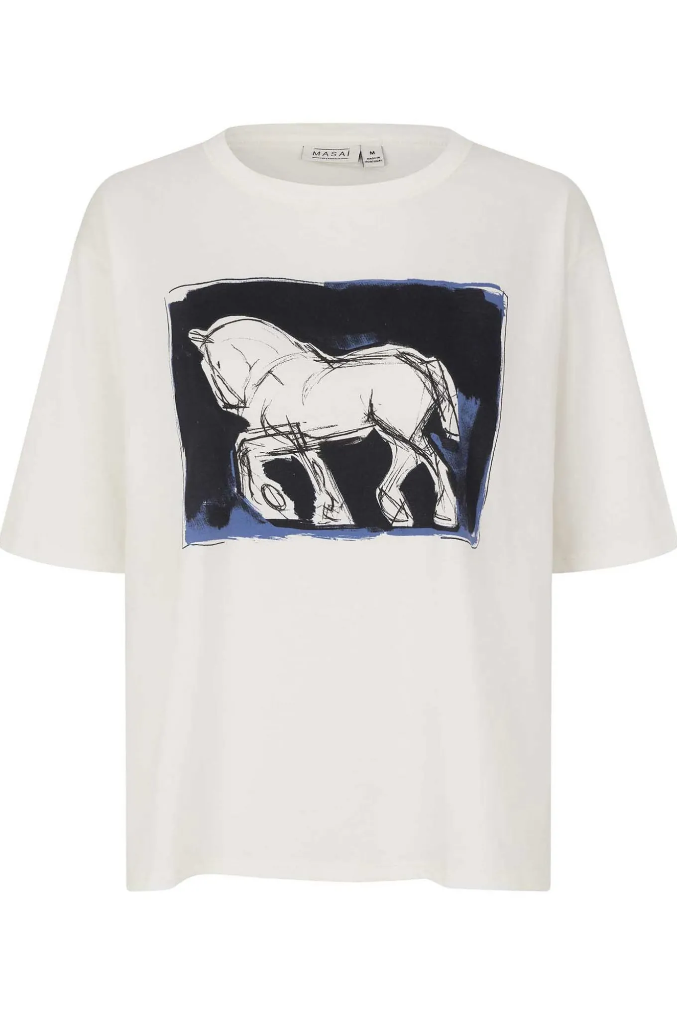 OBS! Fjernlager. Levering kan blive forlænget med 2-3 dage, hvis varen ikke findes i vores butik lige nu.Smart tee fra Masai med korte ærmer, rund hals og et flot malerisk print på fronten.