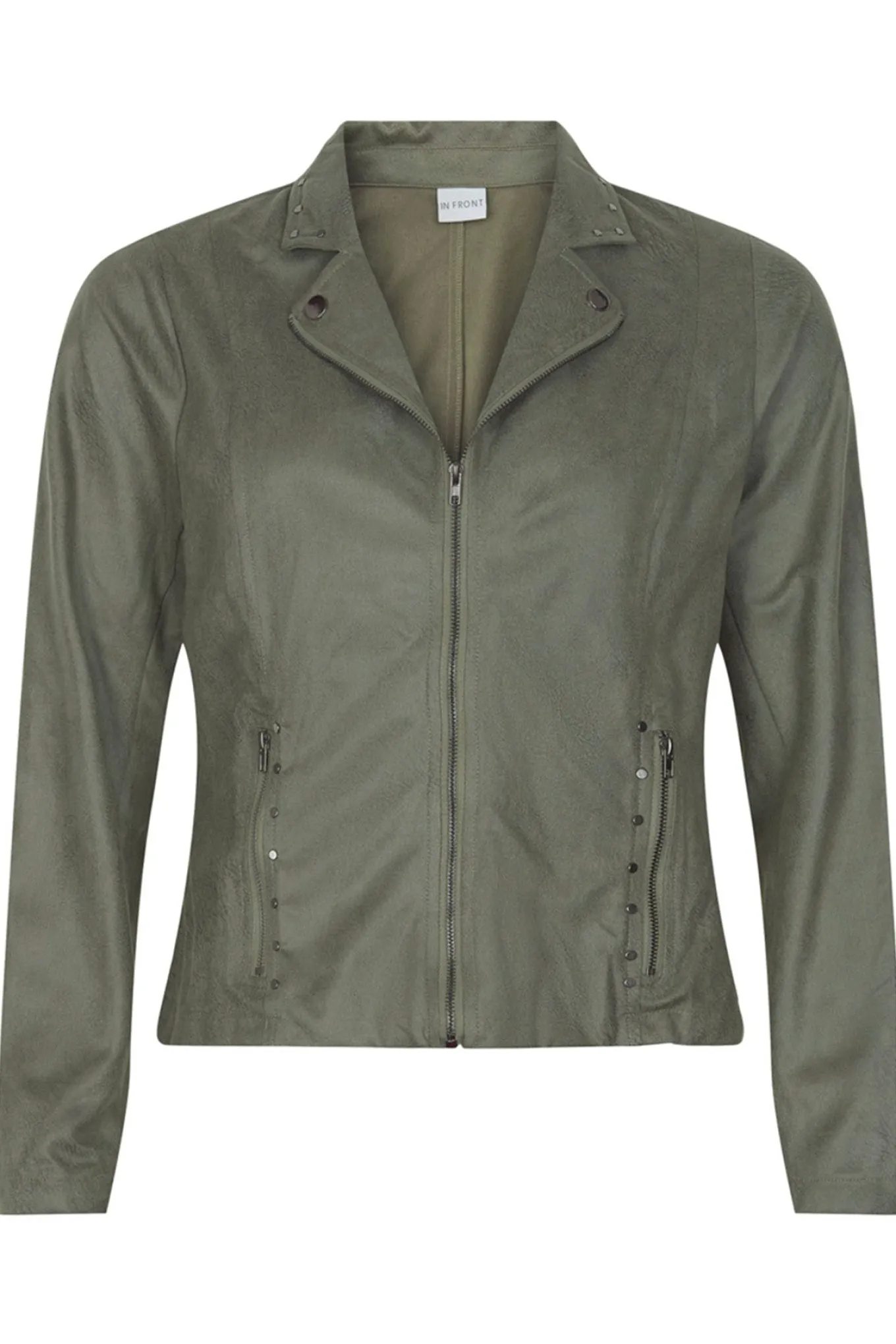 - Smart kort jakke fra In Front. Jakken har krave, lommer med lynlås og lukkes foran med lynlås. Yderligere er jakken dekoreret med små nitter ved lommerne og på kraven