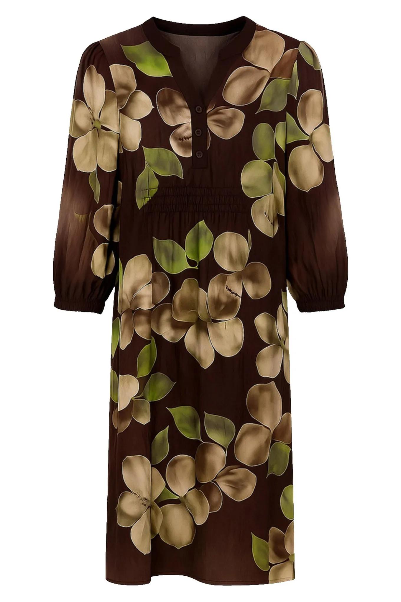 Føl dig elegant og komfortabel med denne blomstret kjole i 100% viskose fra 2-BIZ. Den brune farve giver et naturligt og tidløst udtryk, perfekt til enhver lejlighed.