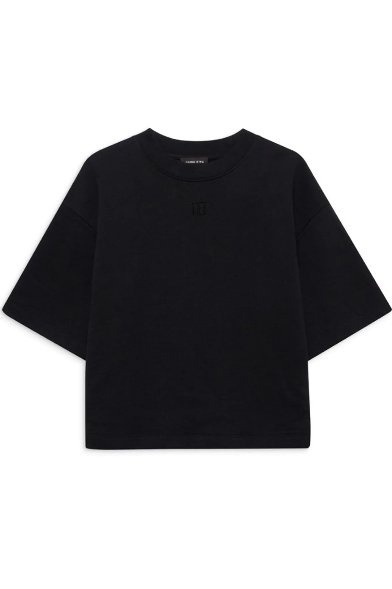 - OBS! Fjernlager. Levering kan blive forlænget med 2-3 dage, hvis varen ikke findes i vores butik lige nu.Smart tee fra Anine Bing med korte ærmer, rund hals og en cropped længde.