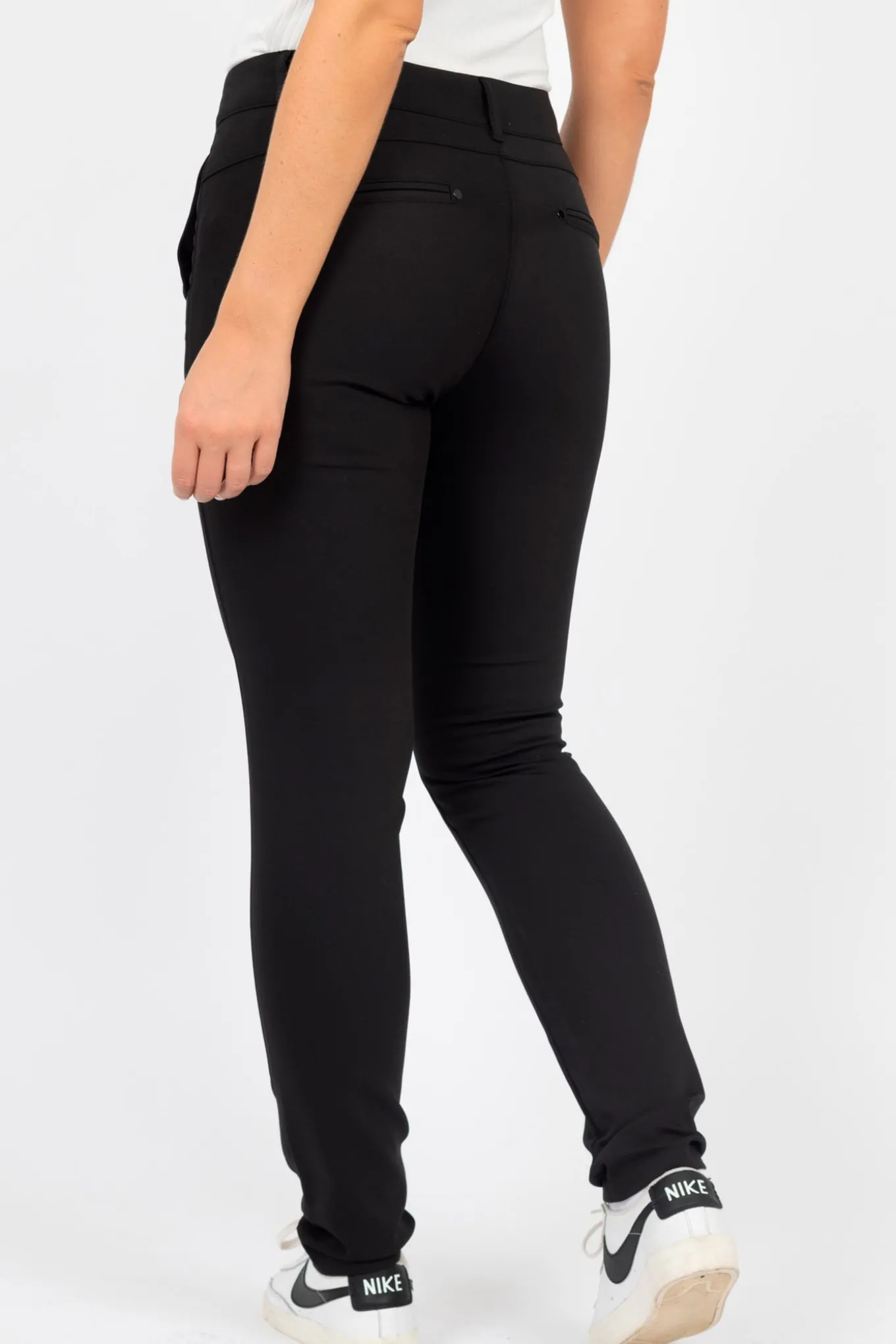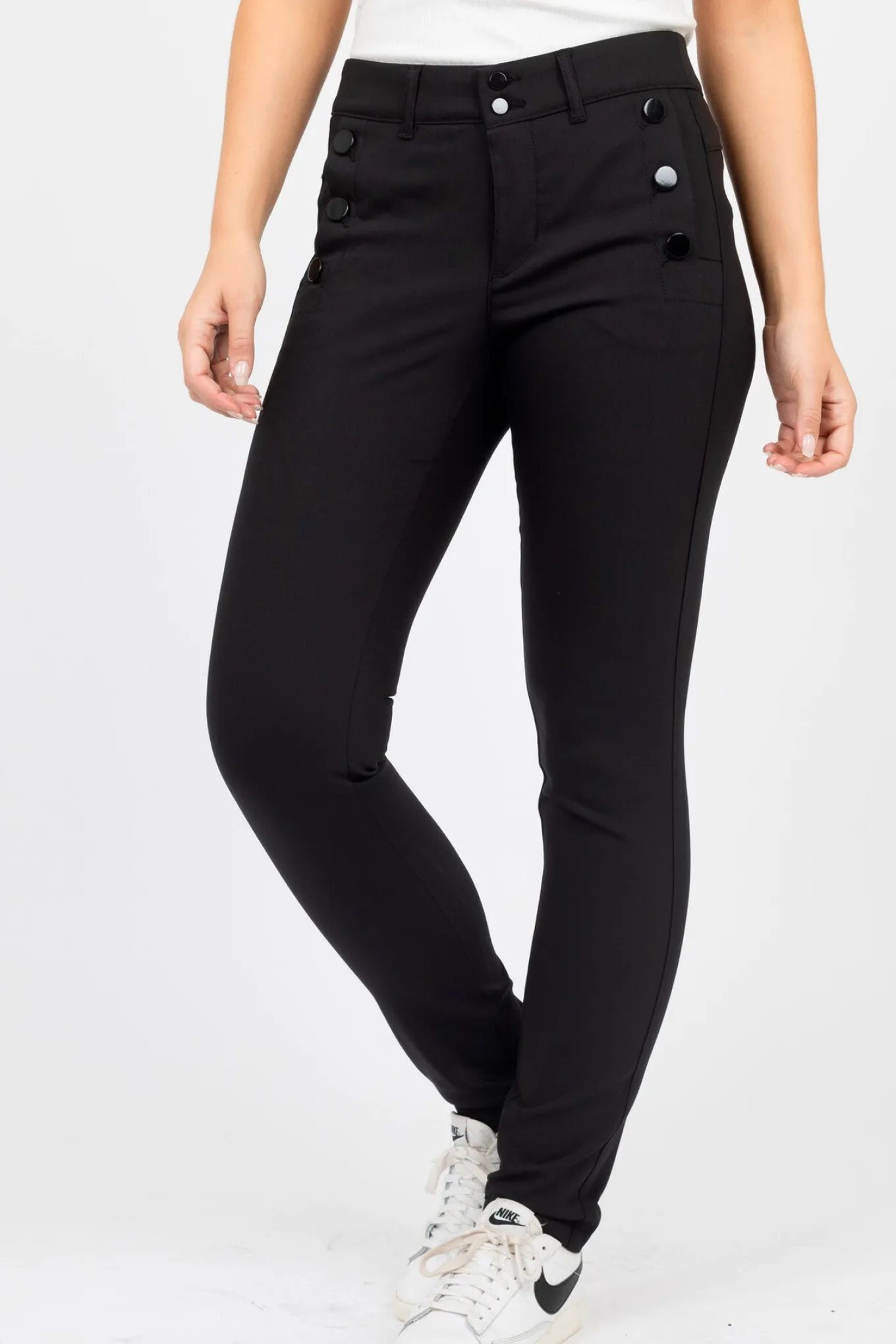 OBS! Fjernlager. Levering kan blive forlænget med 1-2 dage, hvis varen ikke findes i vores butik lige nu.Smarte og velsiddende bukser fra 2-Biz i sort. 2-Biz har med Karcemona buksen opnået stor succes og mange kvinder er rigtig glade for denne model og pasform, som nu er kommet i denne lidt mere elegante Nicky udgave. Bukserne har nogle fine detaljer ved lommerne via tre søde blanke knapper. Stylen lukkes med to knapper og lynlås.