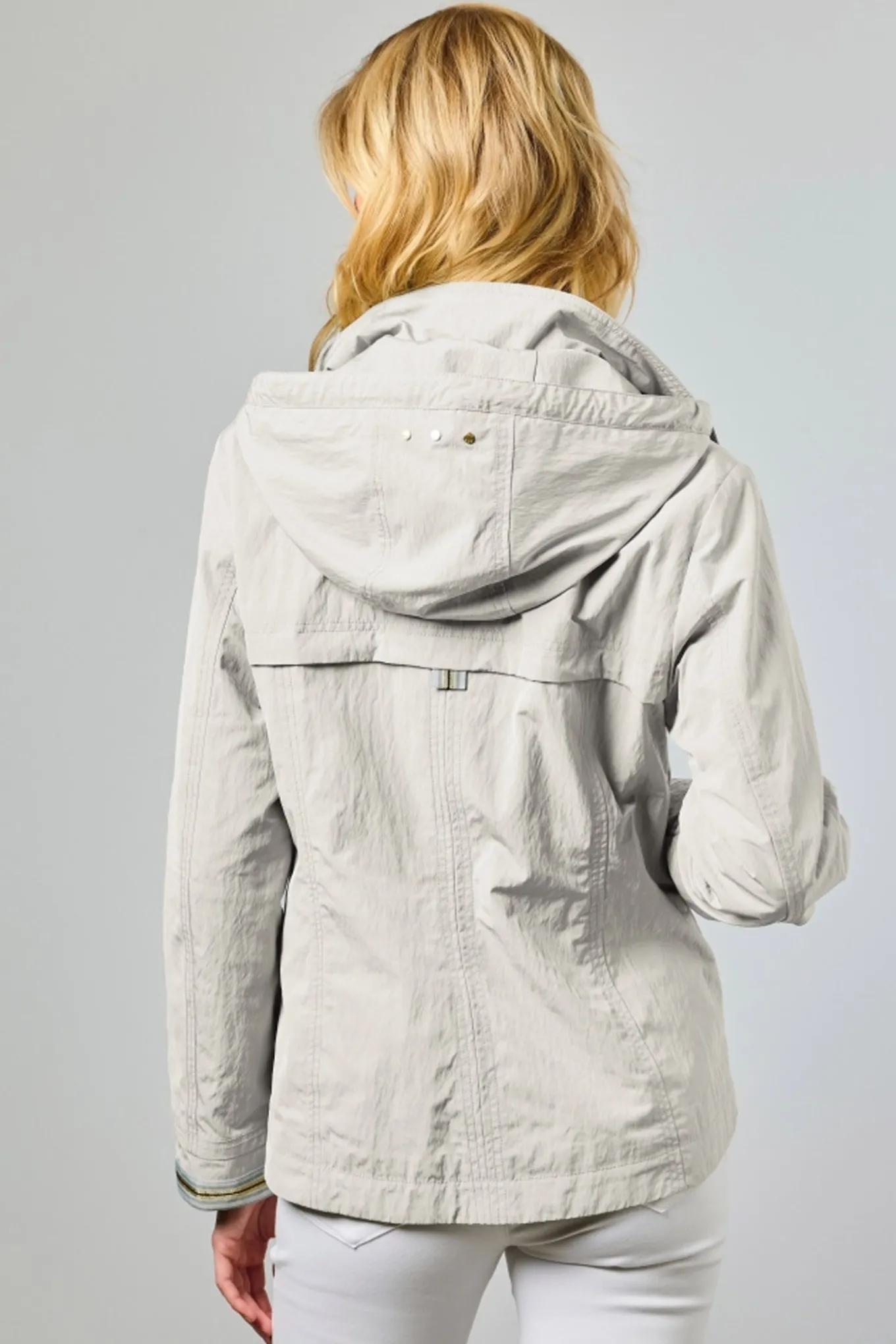 – Aftagelig hætte med printet snorStribede bånd på manchetter og lynlås i skalfarve, lysegrå og guld