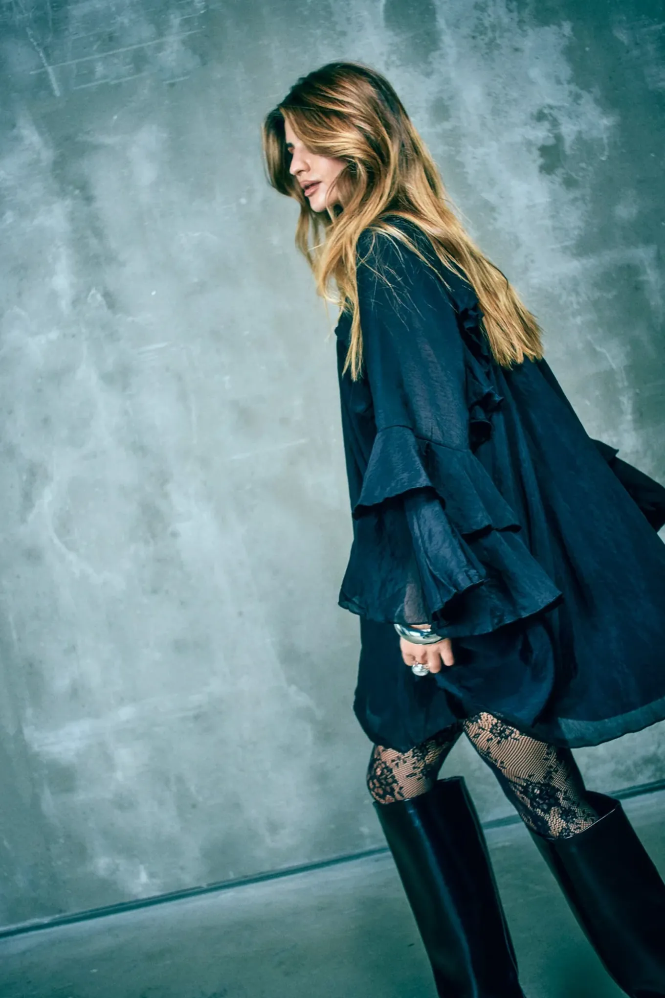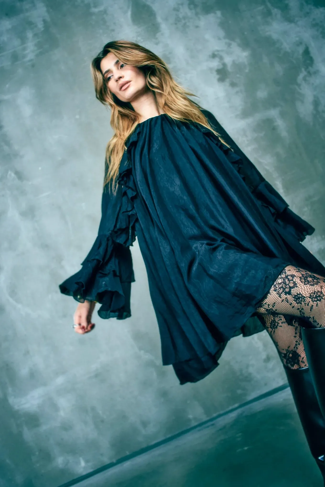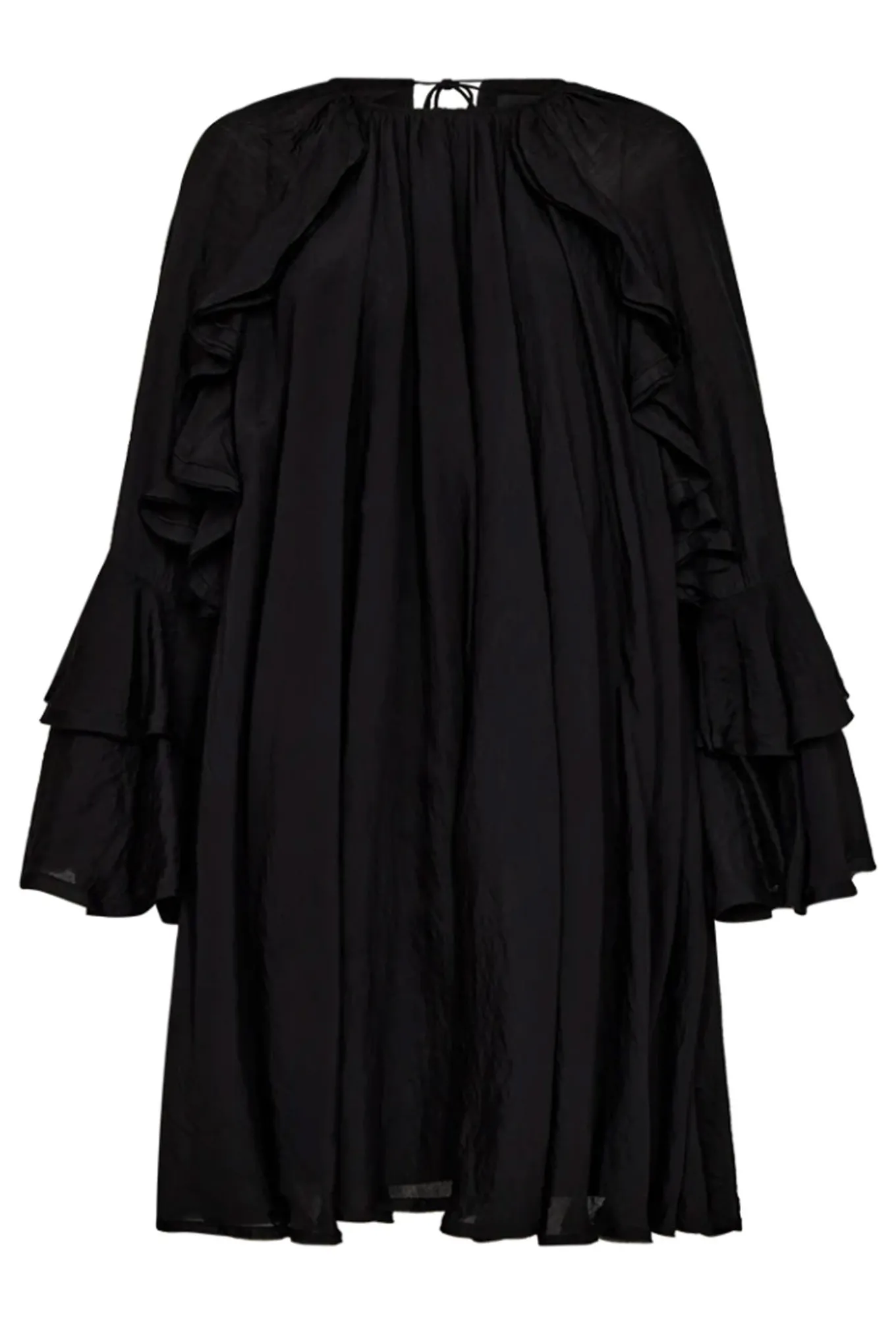 OBS! Fjernlager. Levering kan blive forlænget med 2-3 dage, hvis varen ikke findes i vores butik lige nu.Kort kjole fra Copenhagen Muse i en eksklusiv, transparent kvalitet med fuld foring. Kjolen har en slids med bindebånd i nakken, lange justerbare ærmer med vidde og snøre samt flæser med rå kanter, der understreger den vide pasform.