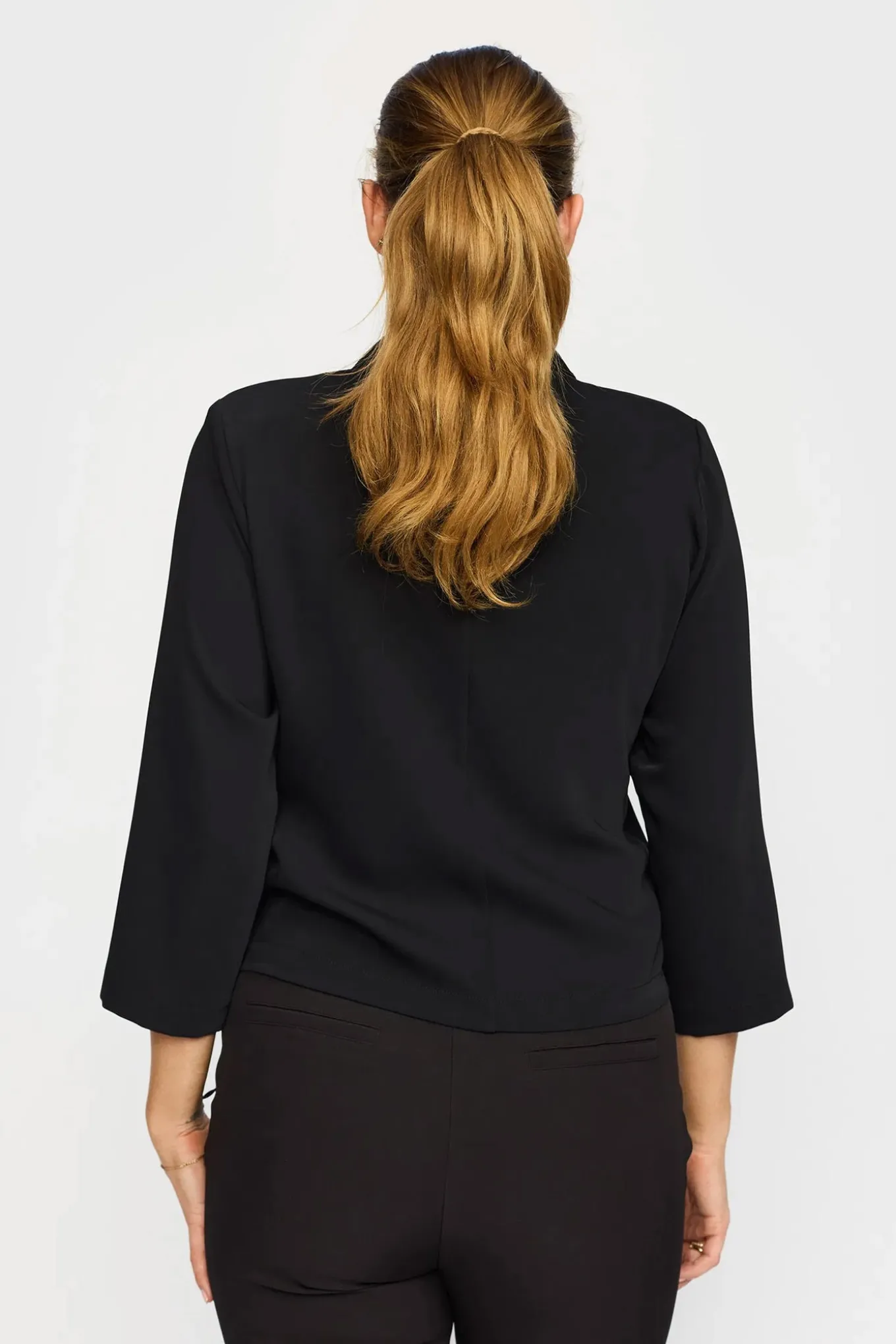 OBS! Fjernlager. Levering kan blive forlænget med 2-3 dage, hvis varen ikke findes i vores butik lige nu.Elegant og enkel blazer fra 2-Biz med ¾ lange ærmer, cropped længde og knaplukning langs fronten.