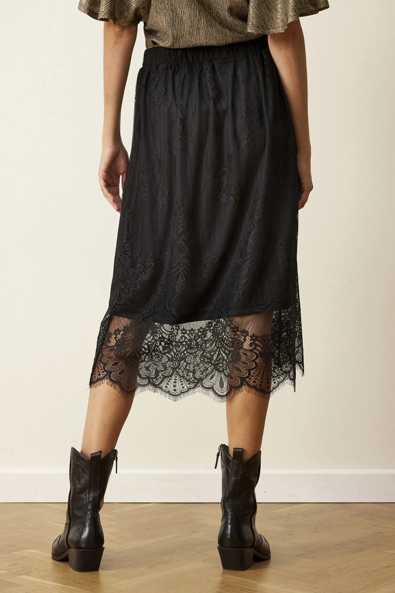- OBS! Fjernlager. Levering kan blive forlænget med 2-3 dage, hvis varen ikke findes i vores butik lige nu.Feminin nederdel fra In Front med en bred elastikkant i taljen og den smukkeste blonde kvalitet.