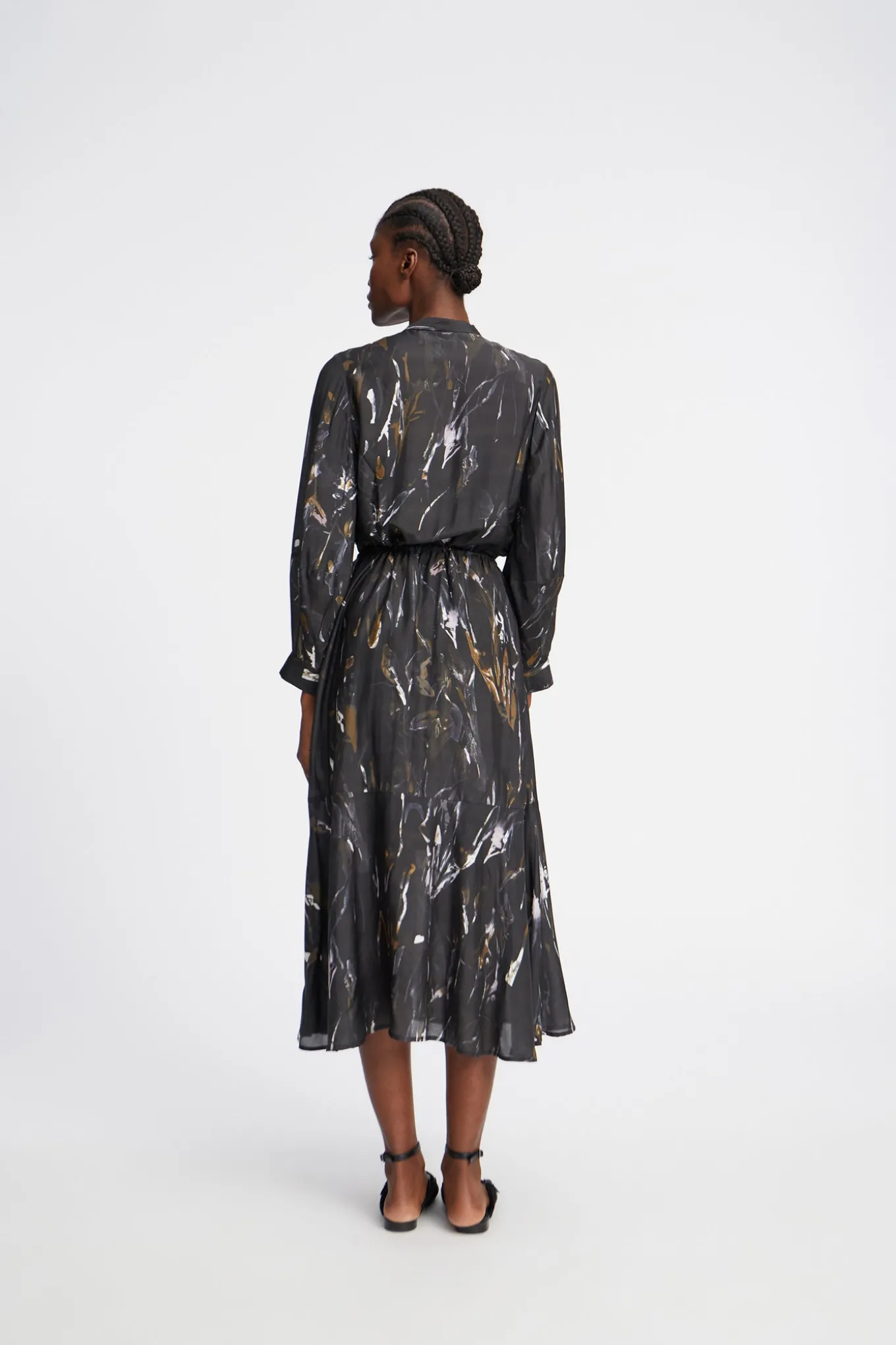OBS! Fjernlager. Levering kan blive forlænget med 2-3 dage, hvis varen ikke findes i vores butik lige nu.Smuk kjole fra Munthe med lange ærmer, kinakrave i halsen og skjult knaplukning langs fronten.Kjolen har også et smalt bindebånd i taljen, en bred flæsekant i bunden af skørtet og et smukt abstrakt print.