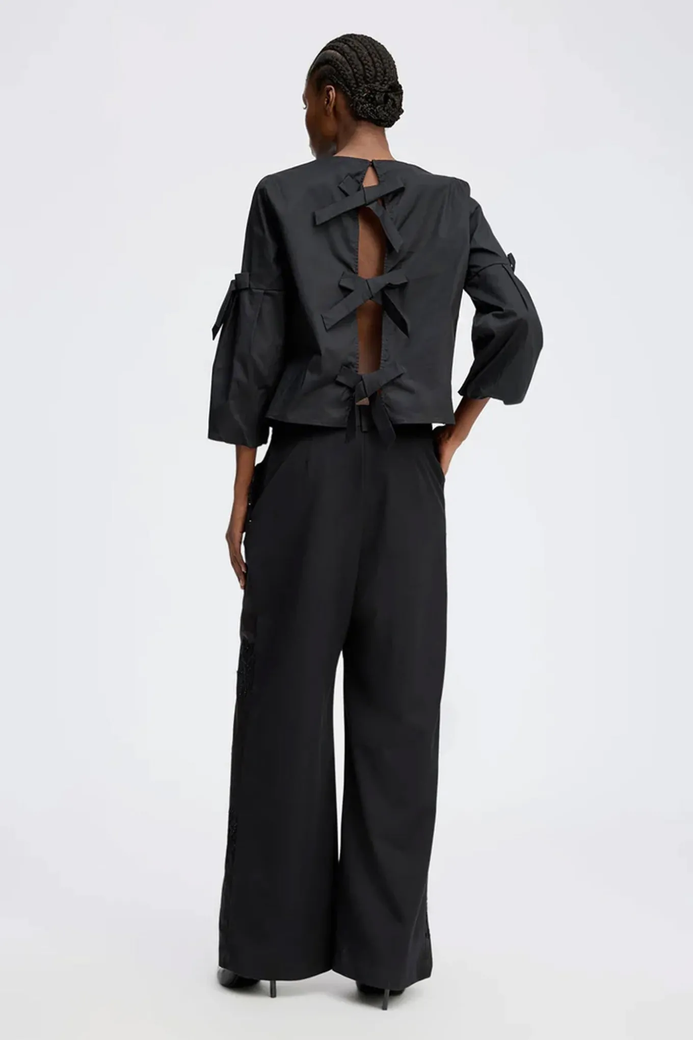 Elegant bluse med fine sløjfedetaljer på ærmer og ryg. Blusen har en smuk rynkedetalje ved hals og ærmer og er designet med åben ryg, som samles ved hjælp af tre fine sløjfer.