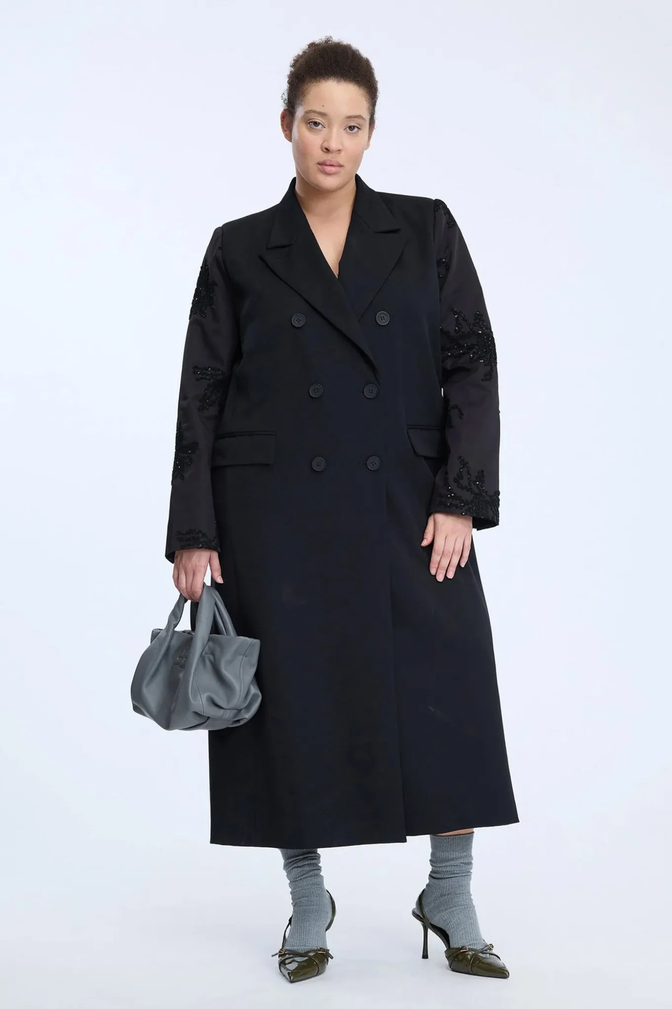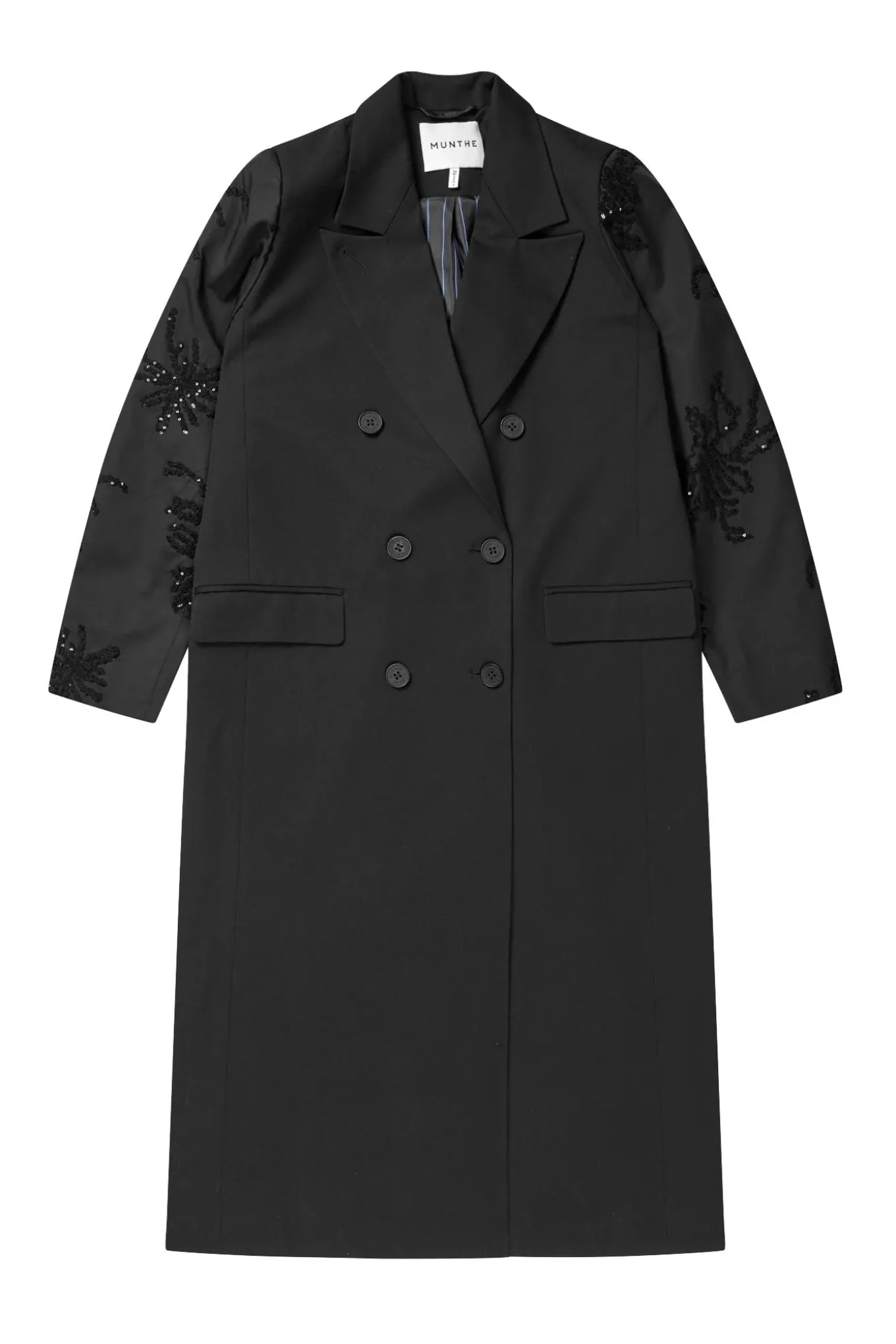 Lang, sort blazerfrakke med dobbeltradet lukning og elegante broderede ærmer prydet med tone-i-tone pailletter og perler. Designet med klassisk revers, klaplommer og en lige, elegant silhuet.