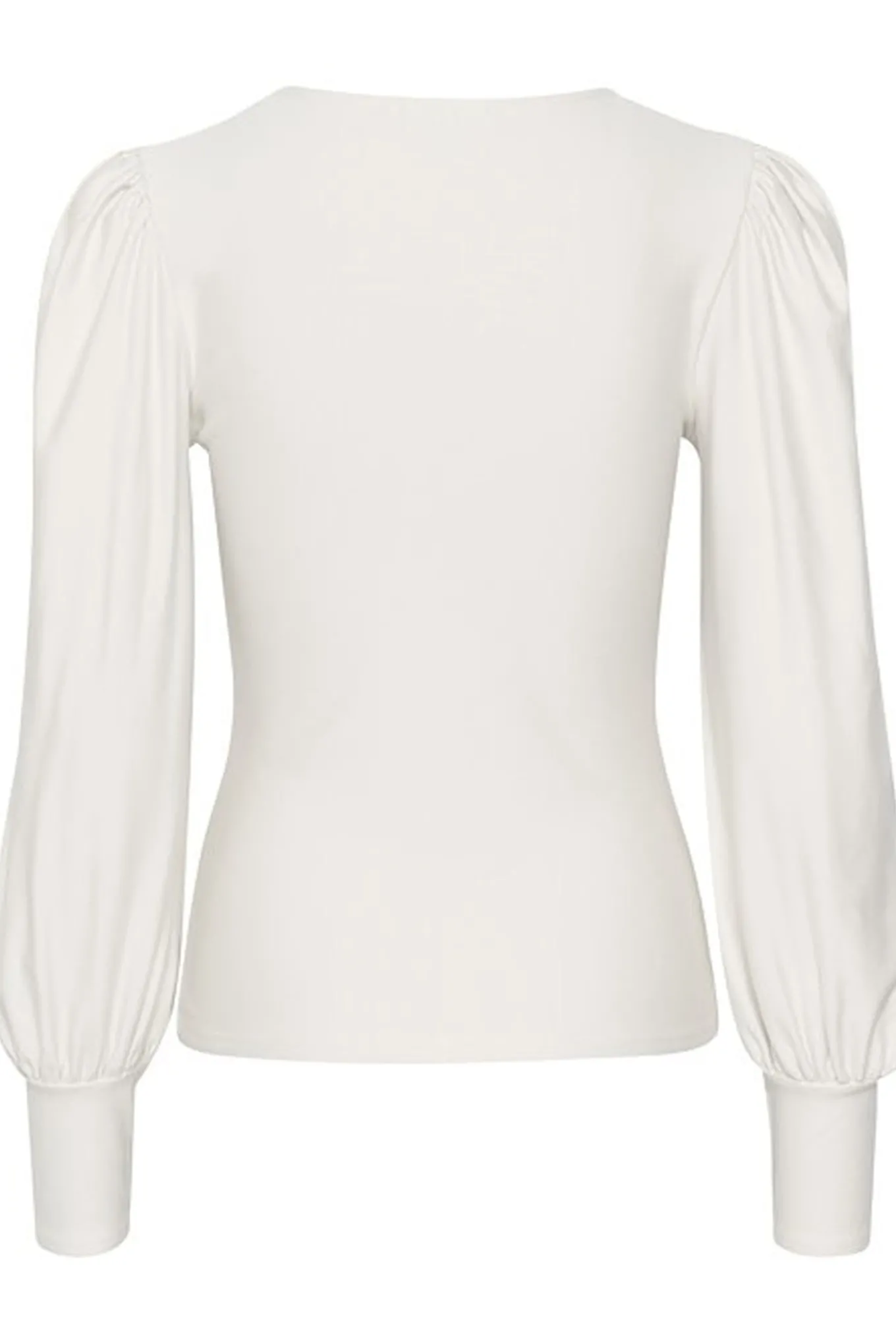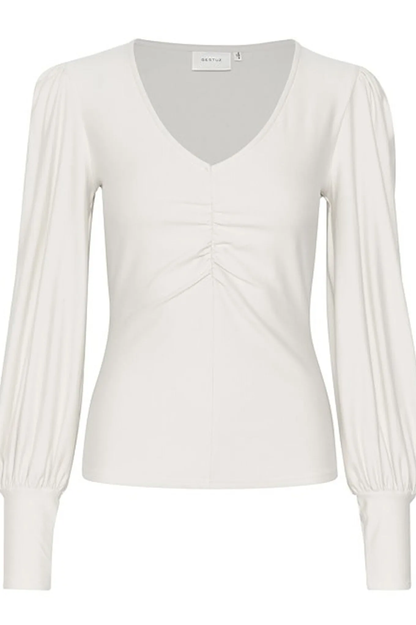 Feminin bluse fra Gestuz med lange pufærmer, v-udskæring i halsen og brede tætsiddende manchetter. Blusen har også fine draperet effekter over brystet og en slim-fit pasform.