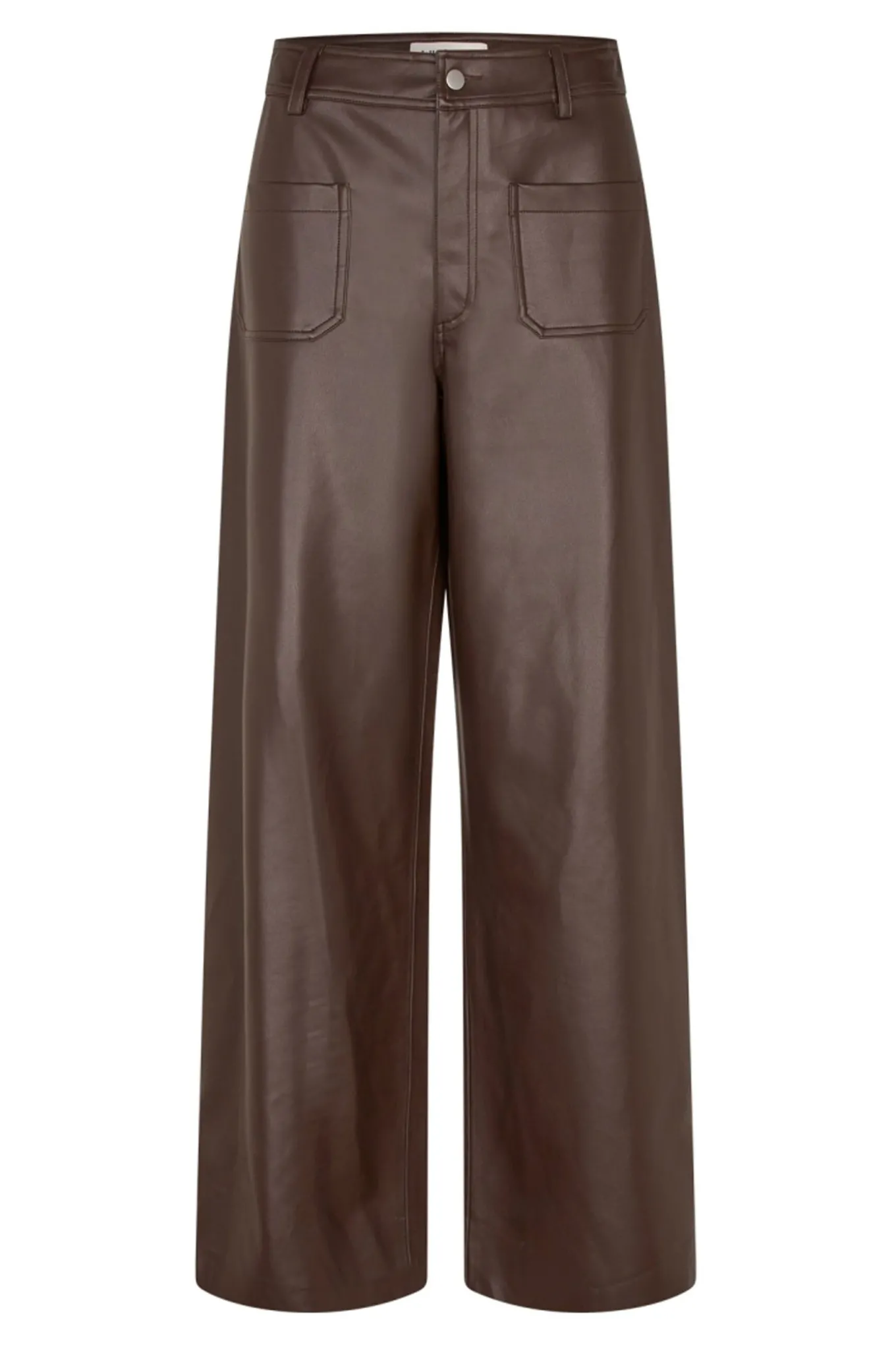 Cool og moderne bukser fra Lollys Laundry i blødt kunstlæder. De har brede ben og en flatterende høj talje med bæltestropper. De to store påsyede lommer foran tilføjer et dristigt, retro-inspireret touch til looket.