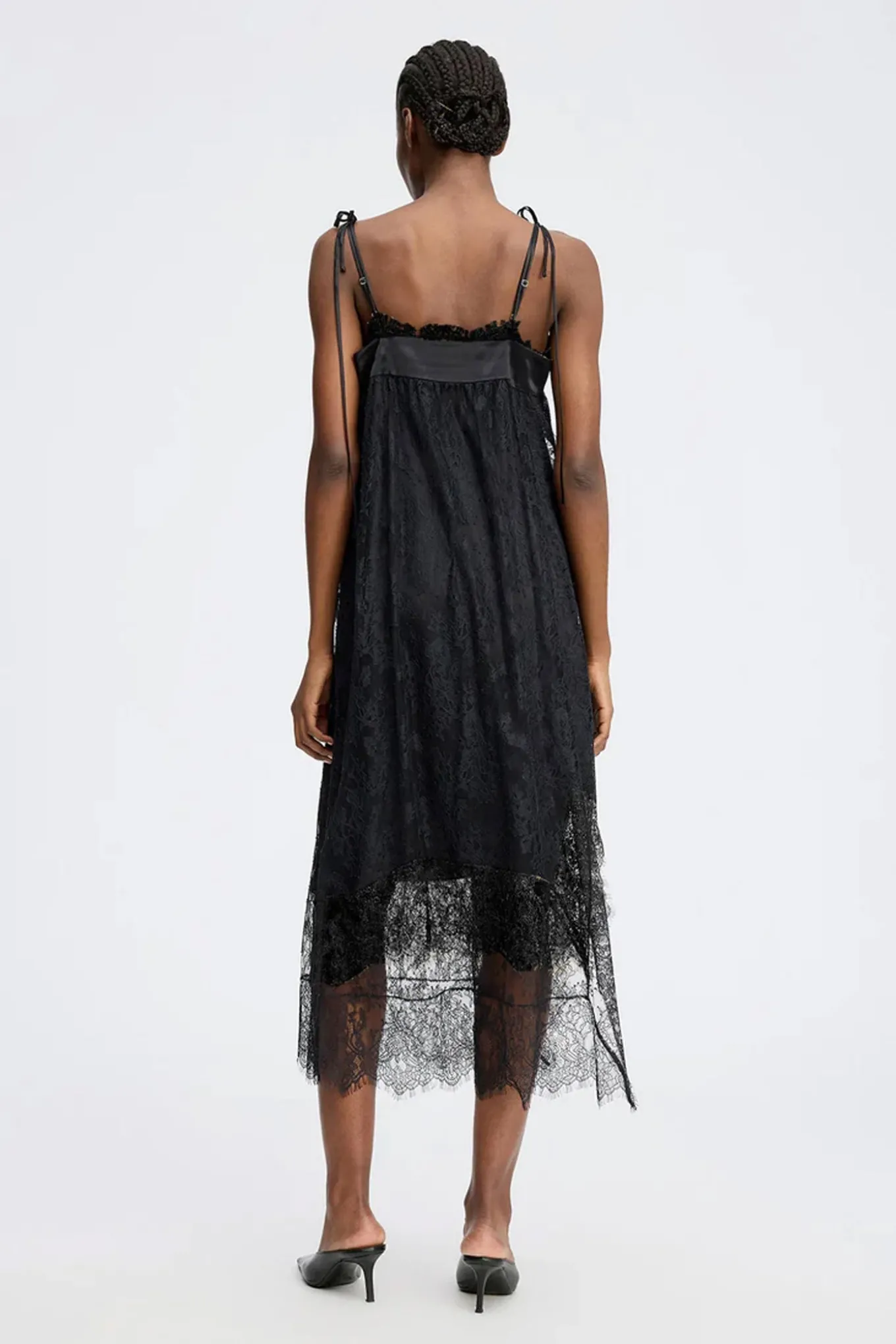 Smuk blondekjole med et elegant bånd i udskæringen og fine bindebånd på skuldrene. Kjolen er designet med en med asymmetrisk blonde kant. Denne alsidige kjole kan styles med og uden underkjole.