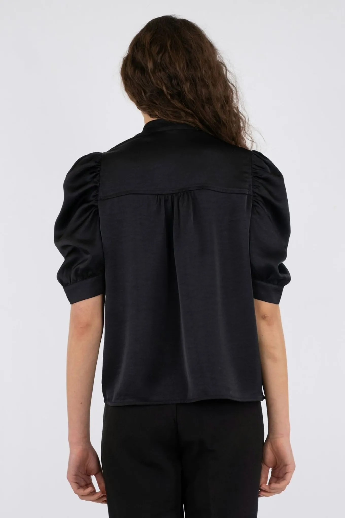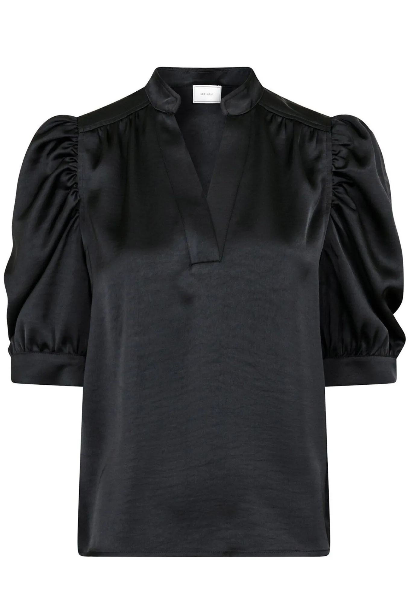 Feminin bluse fra Neo Noir med korte pufærmer, v-udskæring i halsen og en smuk satin kvalitet.