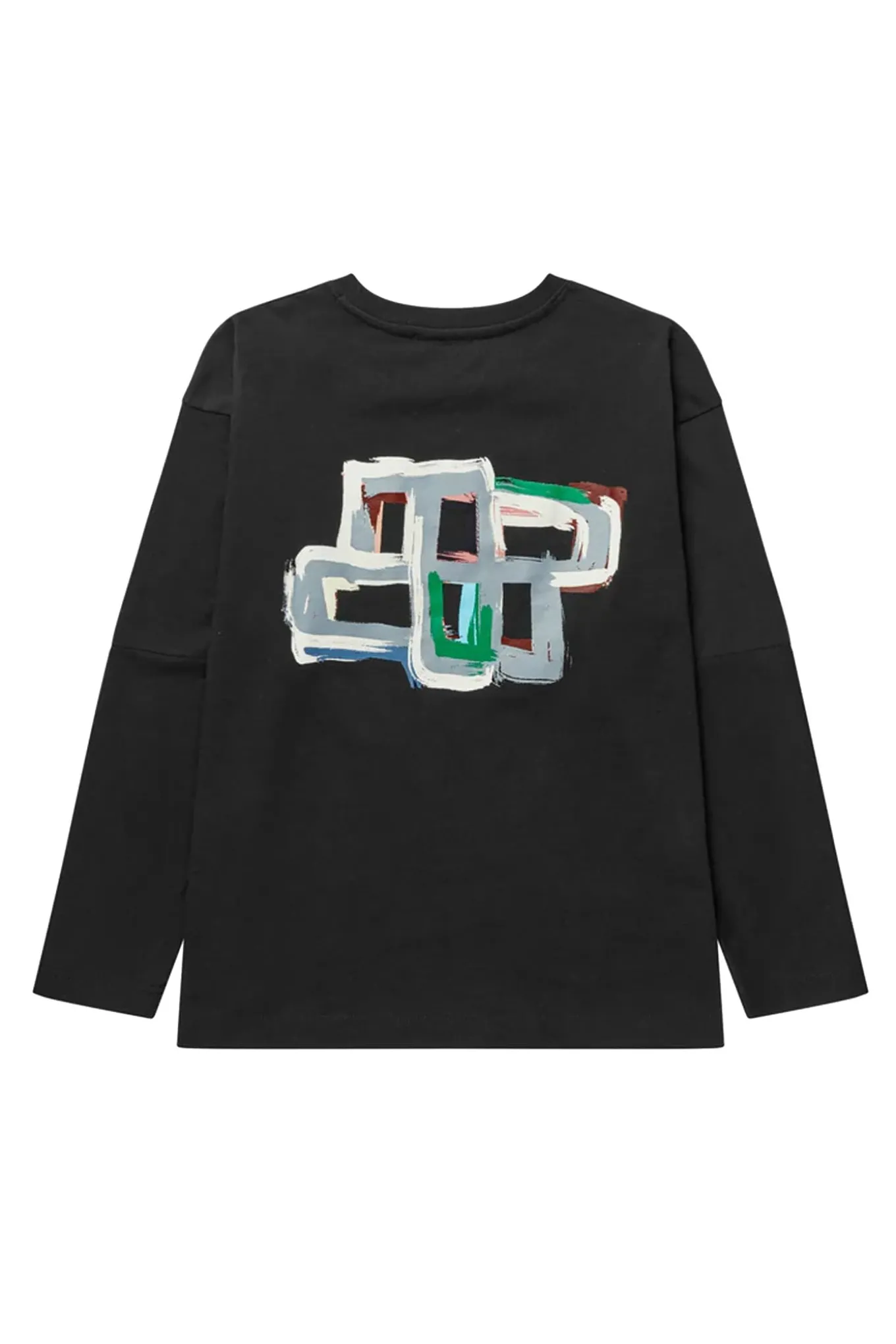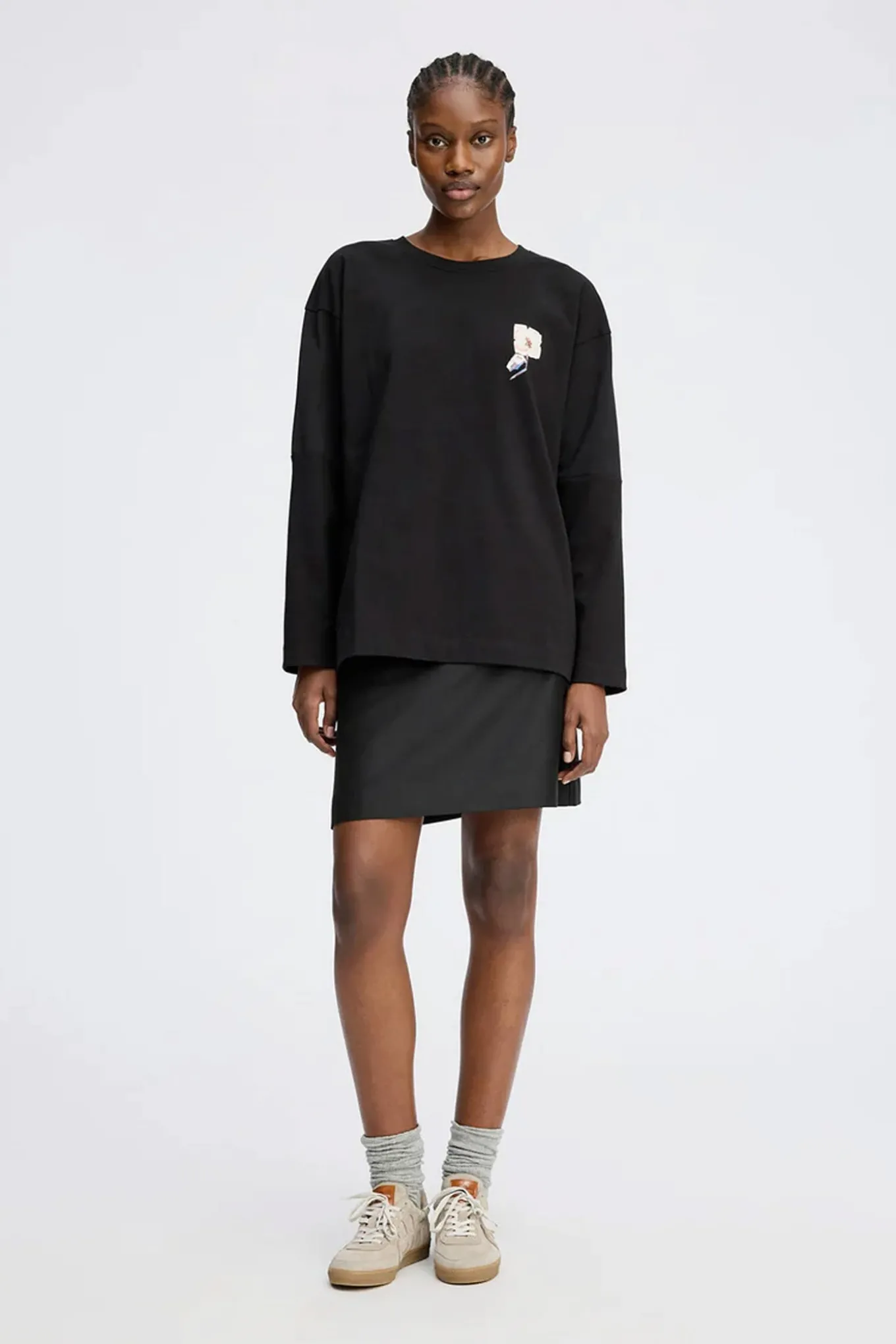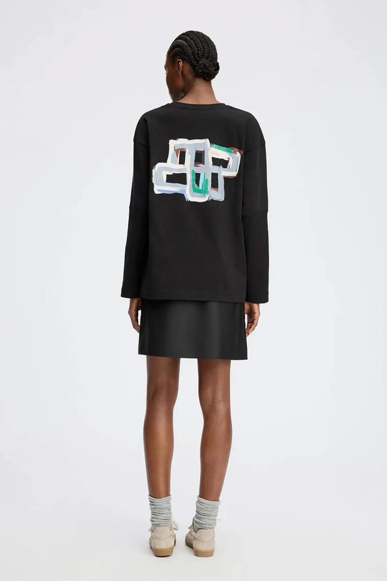 Elegant T-shirt med et lille kunstnerisk blomsterprint på fronten og et smukt grafisk MUNTHE-emblem på ryggen. T-shirten har en løs pasform, lange ærmer og en rund halsudskæring.