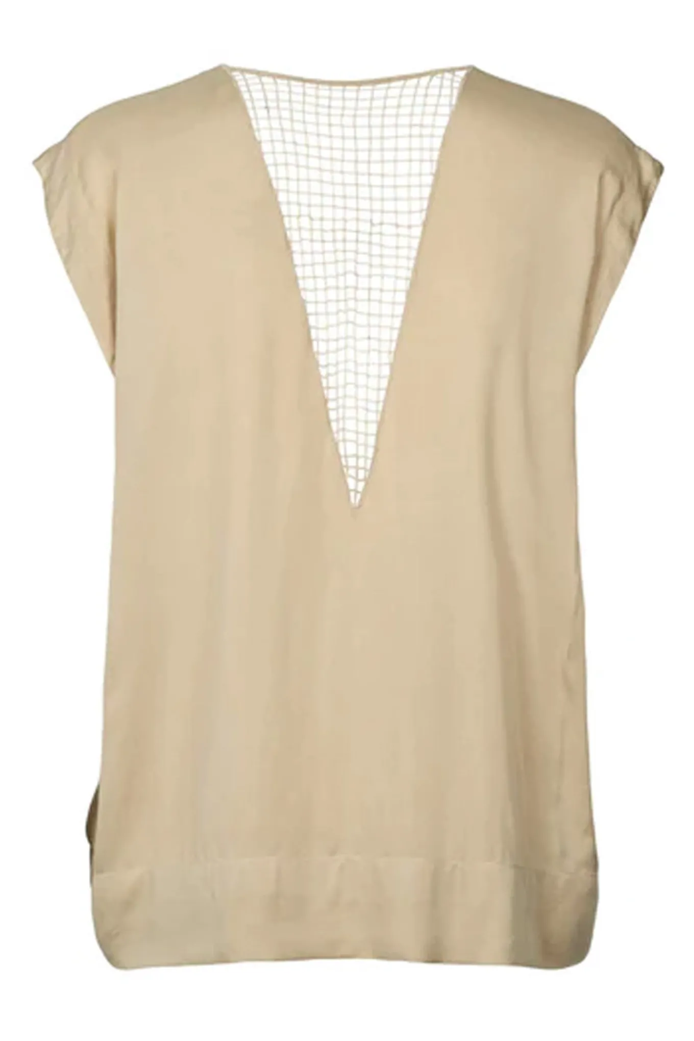 Elegant bluse fra Rabens Saloner med små ærmer, rund hals med en fin nøglehulsudskæring over brystet og en smart blondedetalje i ryggen.