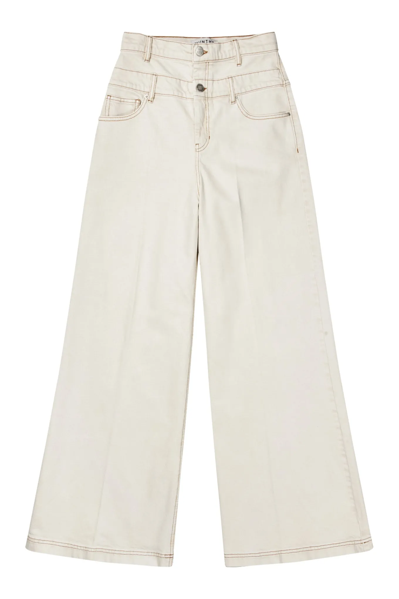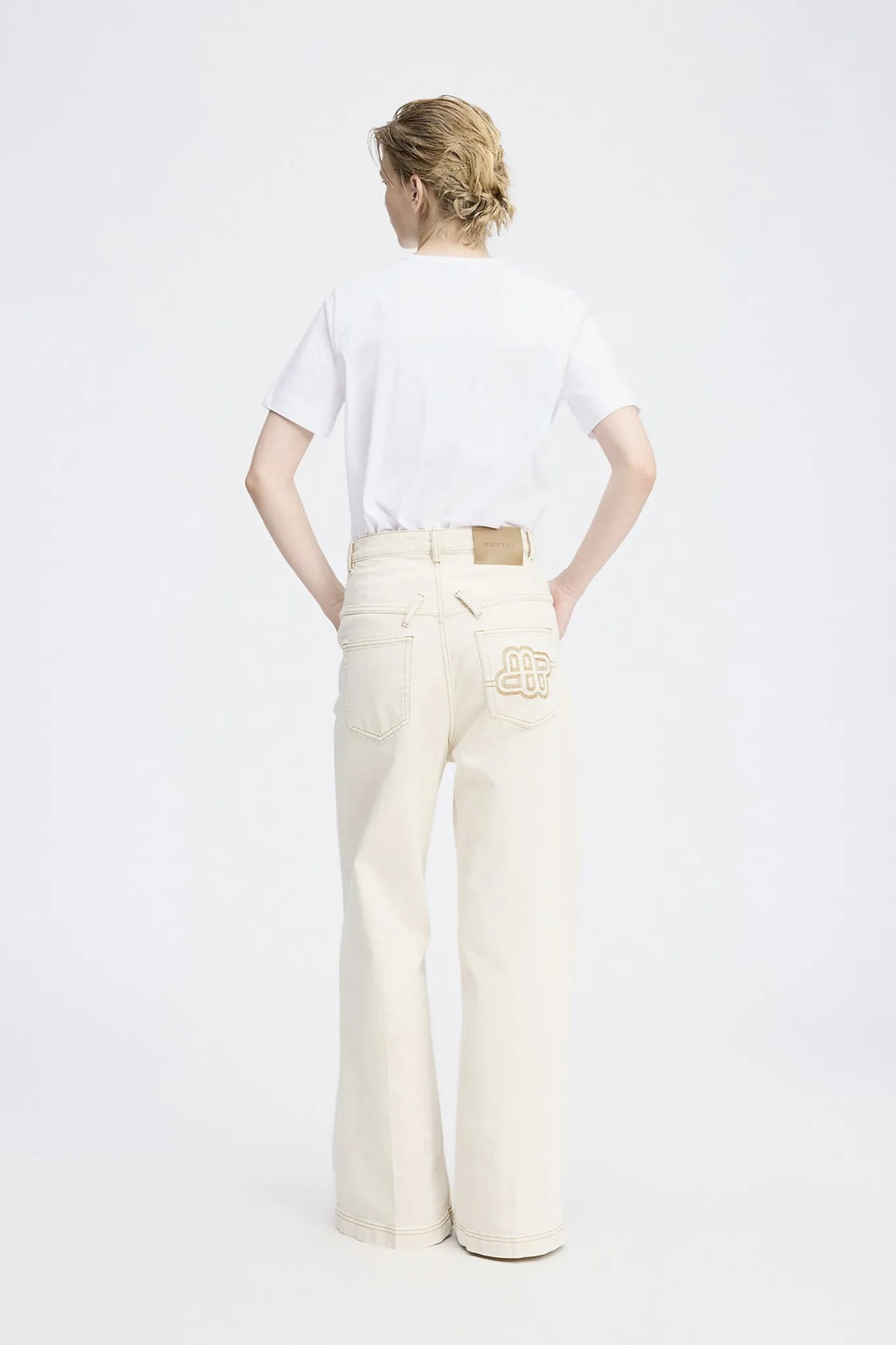Højtaljede bukser i denim kvalitet med kontrastsyninger. Disse jeans er designet med et smukt MUNTHE emblem på baglommen, bredde ben, bæltestropper, lommer og en elegant dobbelt knaplukning.