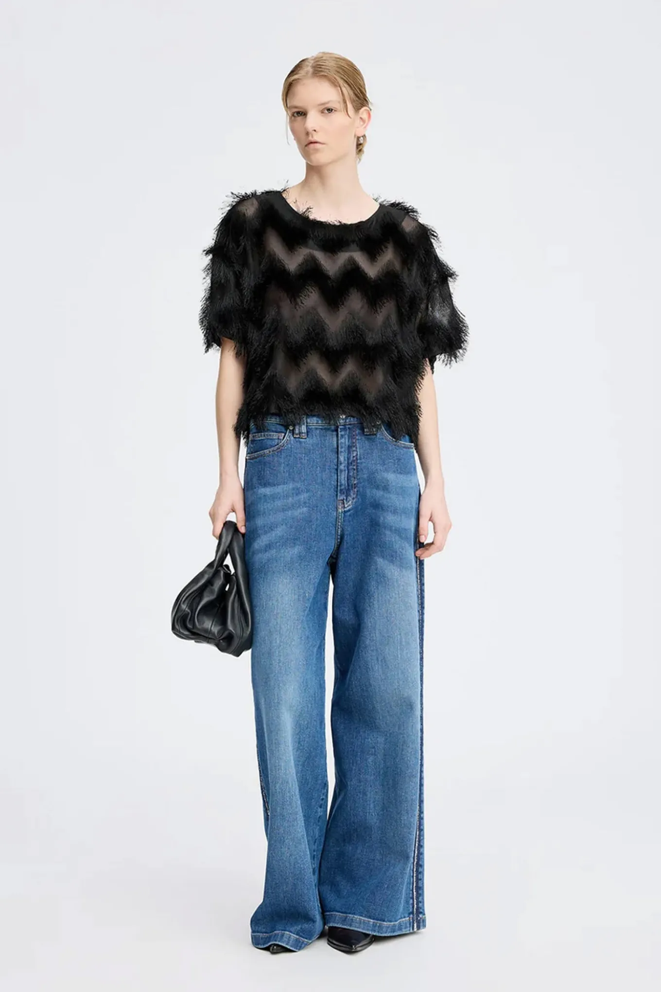 En statement-top designet med korte ærmer og en løs pasform, fremstillet i et markant frynset materiale, der skaber en stilfuld silhuet med en elegant tekstur.