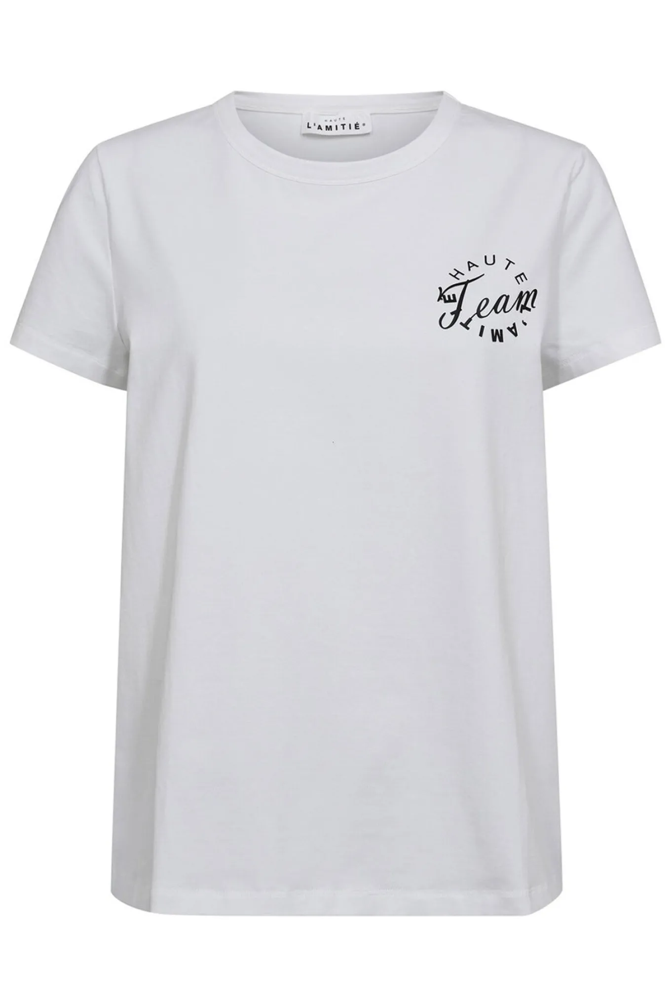 OBS! Fjernlager. Levering kan blive forlænget med 2-3 dage, hvis varen ikke findes i vores butik lige nu.Smart tee fra Haute L’Ámitié med korte ærmer, rund hals og et fint lille print på brystet.