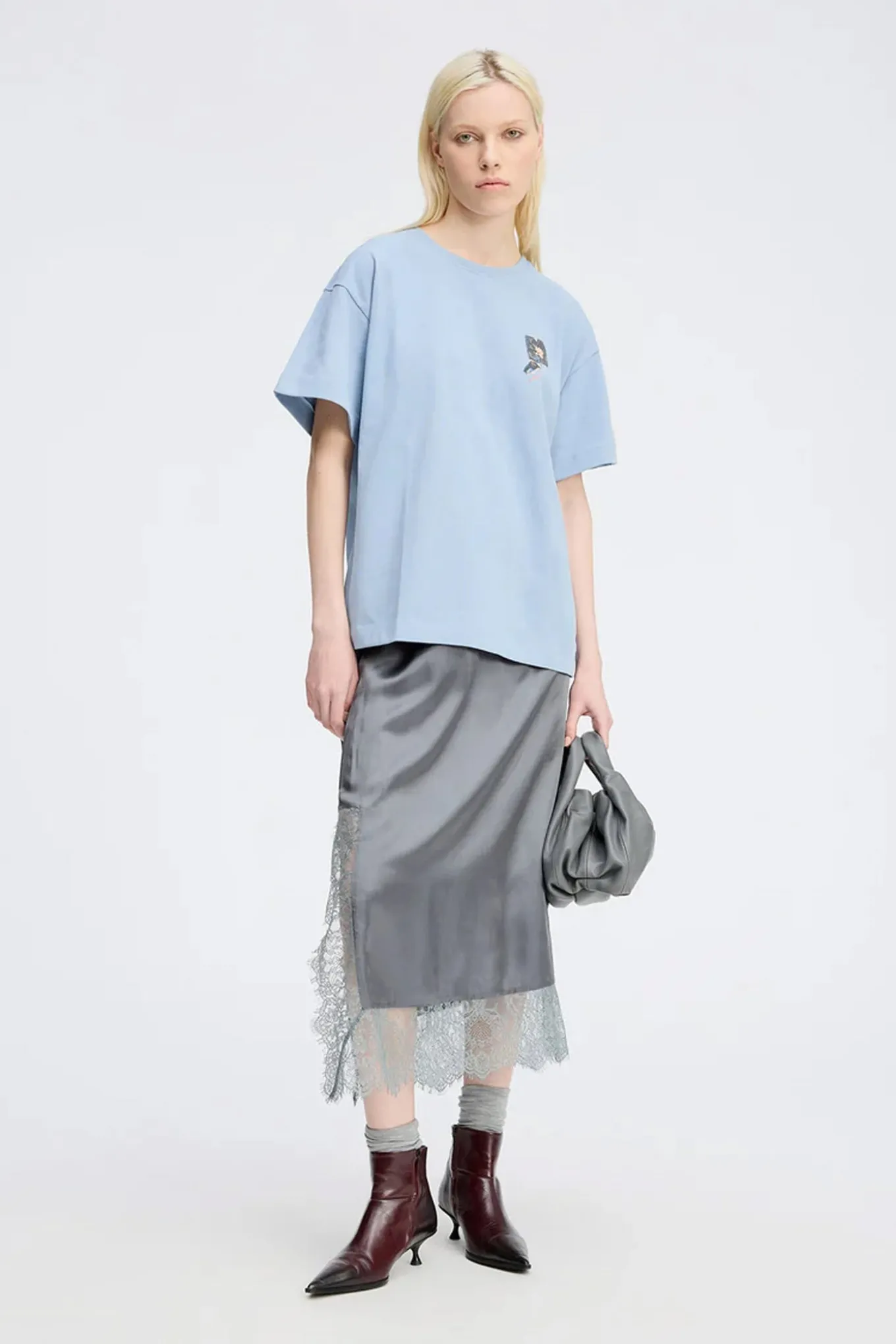 Elegant T-shirt med et lille kunstnerisk blomsterprint på fronten og et smukt grafisk MUNTHE-emblem på ryggen. T-shirten har en løs pasform, korte ærmer og en rund halsudskæring.