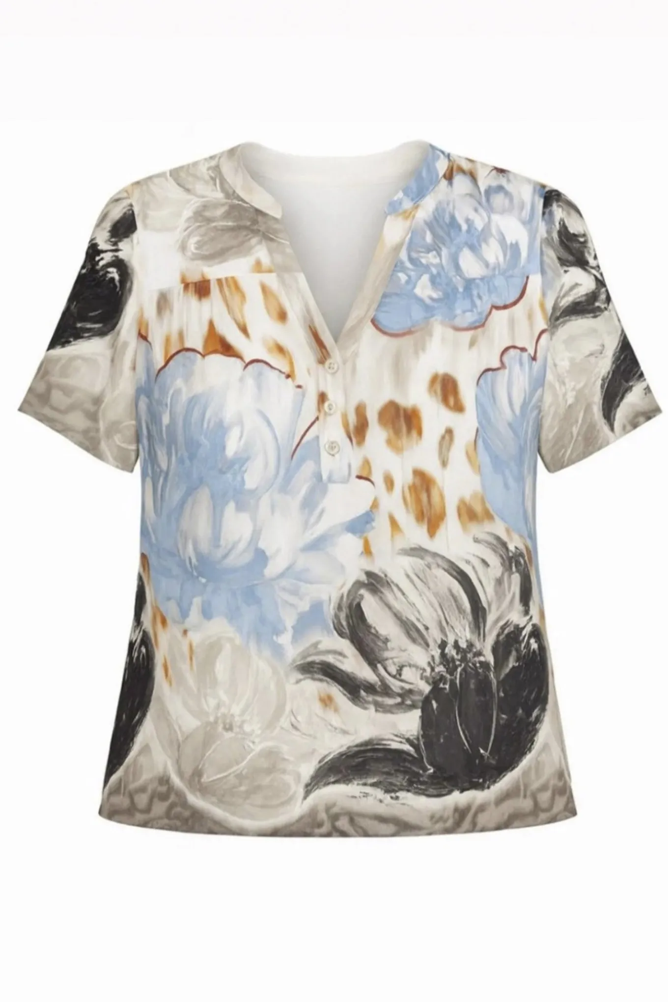 OBS! Fjernlager. Levering kan blive forlænget med 2-3 dage, hvis varen ikke findes i vores butik lige nu.Super flot bluse fra 2-Biz med korte ærmer, rund hals med v-udskæring og det smukkeste abstrakt print.