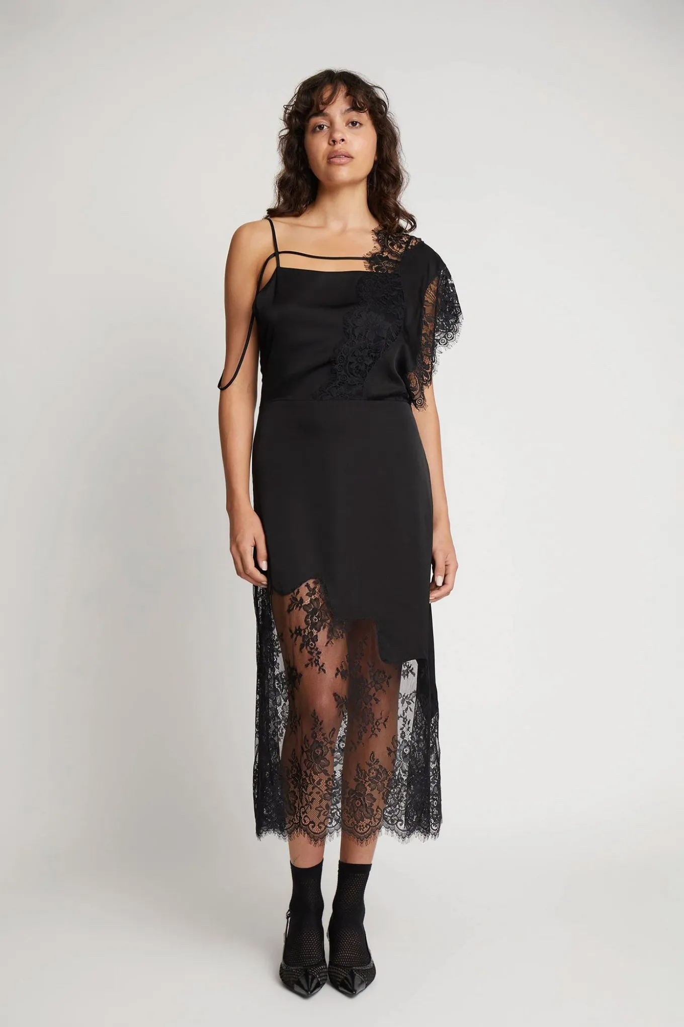 OBS! Fjernlager. Levering kan blive forlænget med 2-3 dage, hvis varen ikke findes i vores butik lige nu.En smuk, detaljeret kjole fra Munthe med elegante blonde applikationer og en fin snor detalje ved bryst og skulder. Kjolen har en asymmetrisk blonde finish nederst.