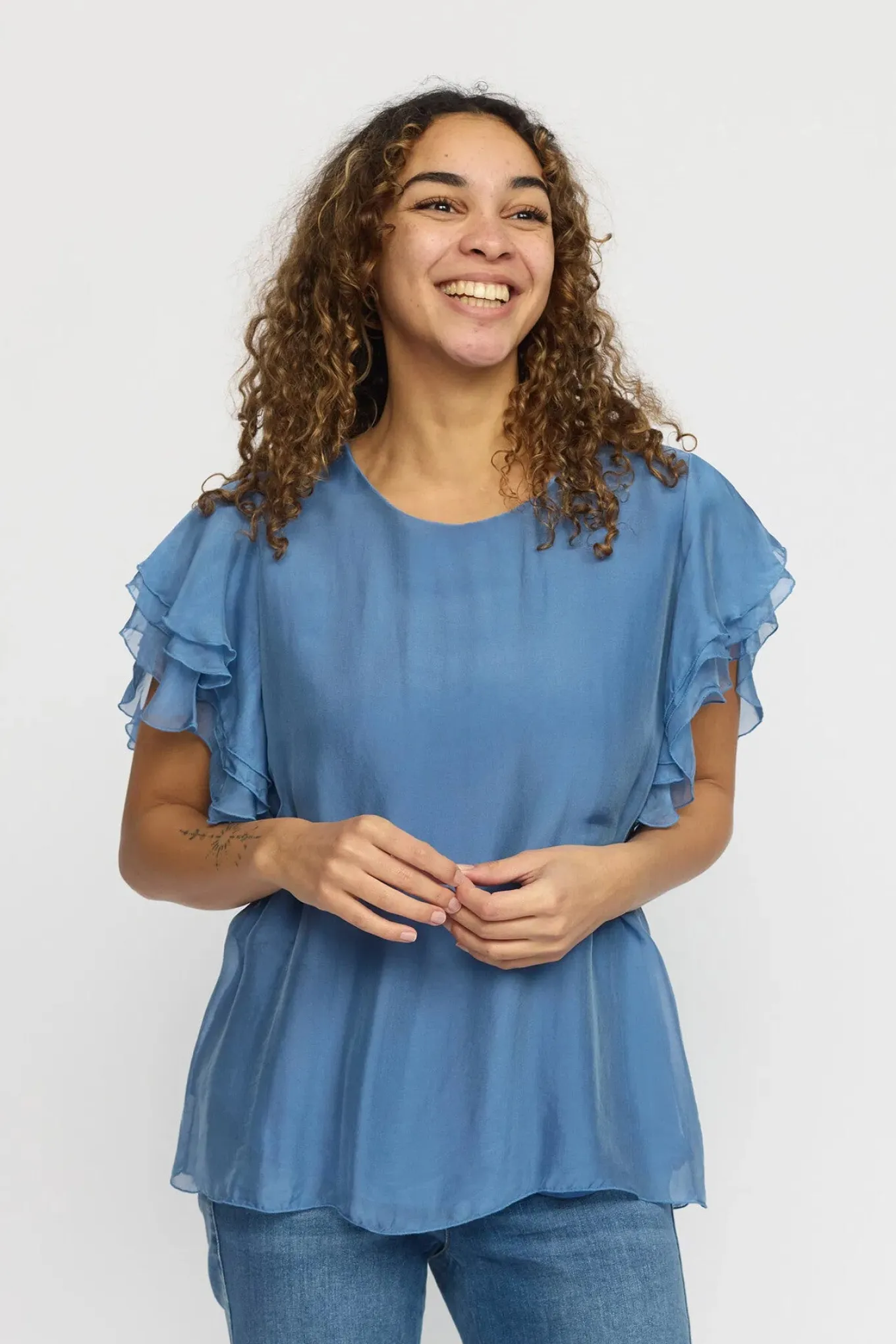 OBS! Fjernlager. Levering kan blive forlænget med 2-3 dage, hvis varen ikke findes i vores butik lige nu.Feminin bluse fra 2-Biz med bådudskæring i halsen og smukke flæseærmer.