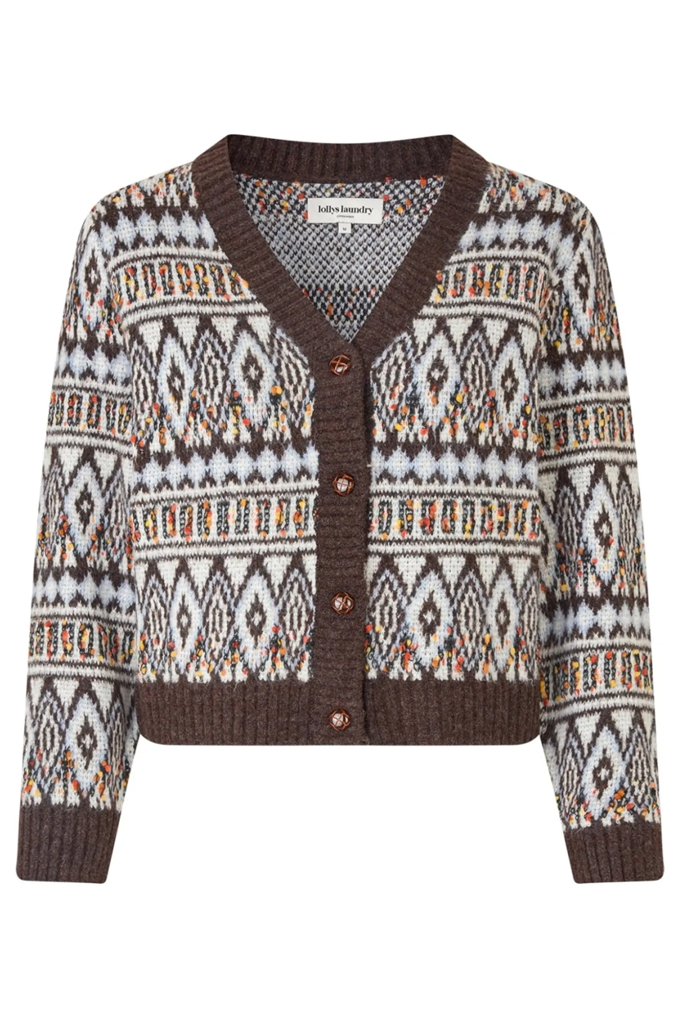 Super lækker cardigan fra Lollys Laundry strikket med et markant mønster og farverige detaljer. Cardiganen er designet i en varm brun base med kontraststrik i råhvid og flerfarvede pletter, der skaber et retro-inspireret look.